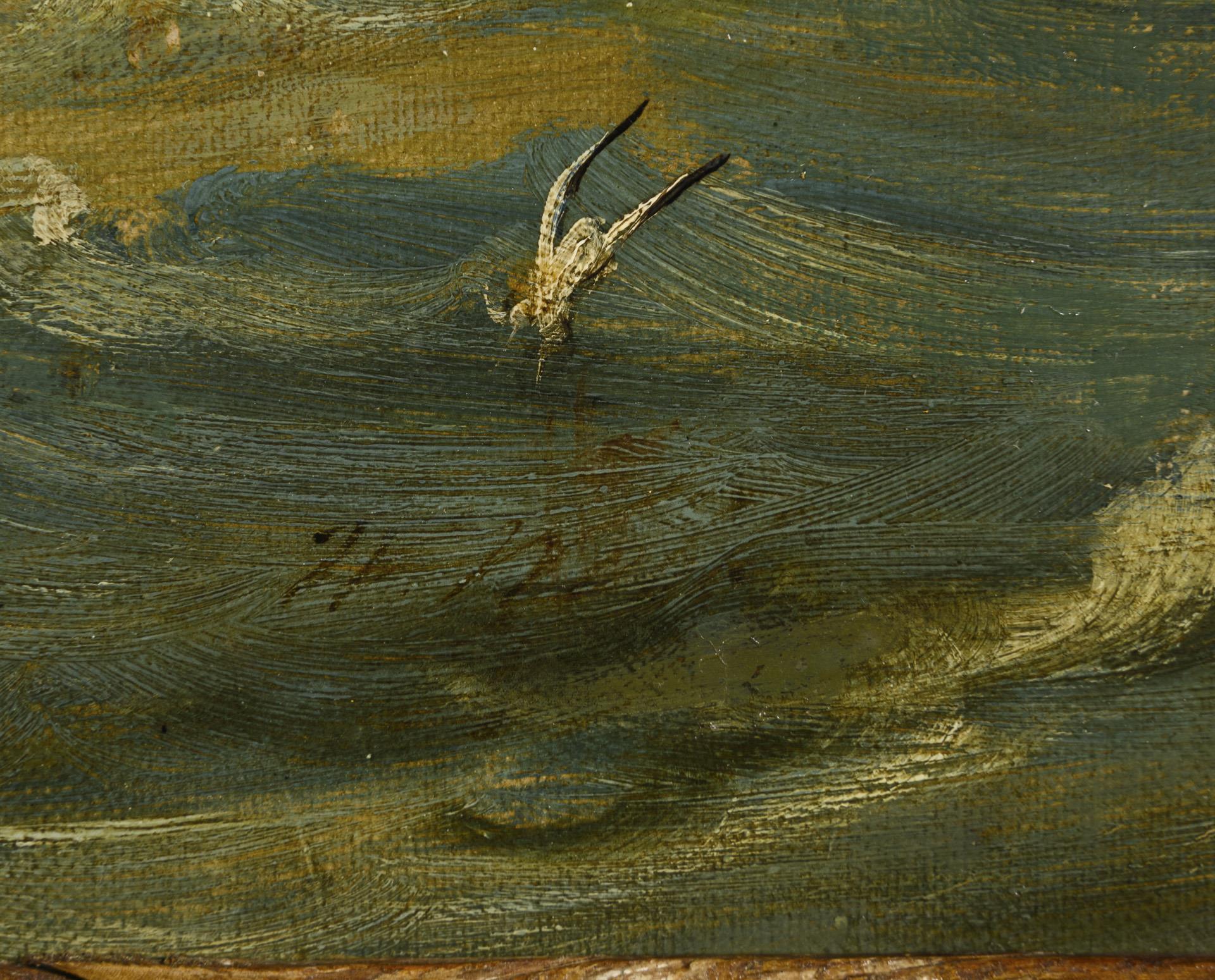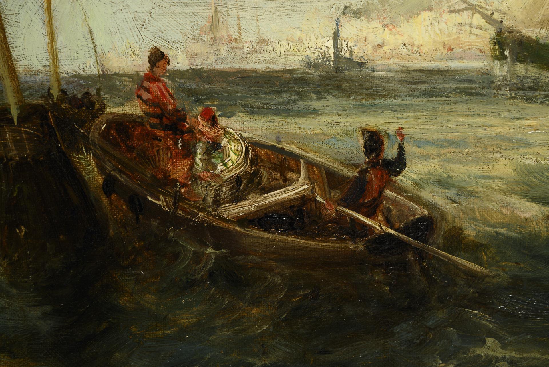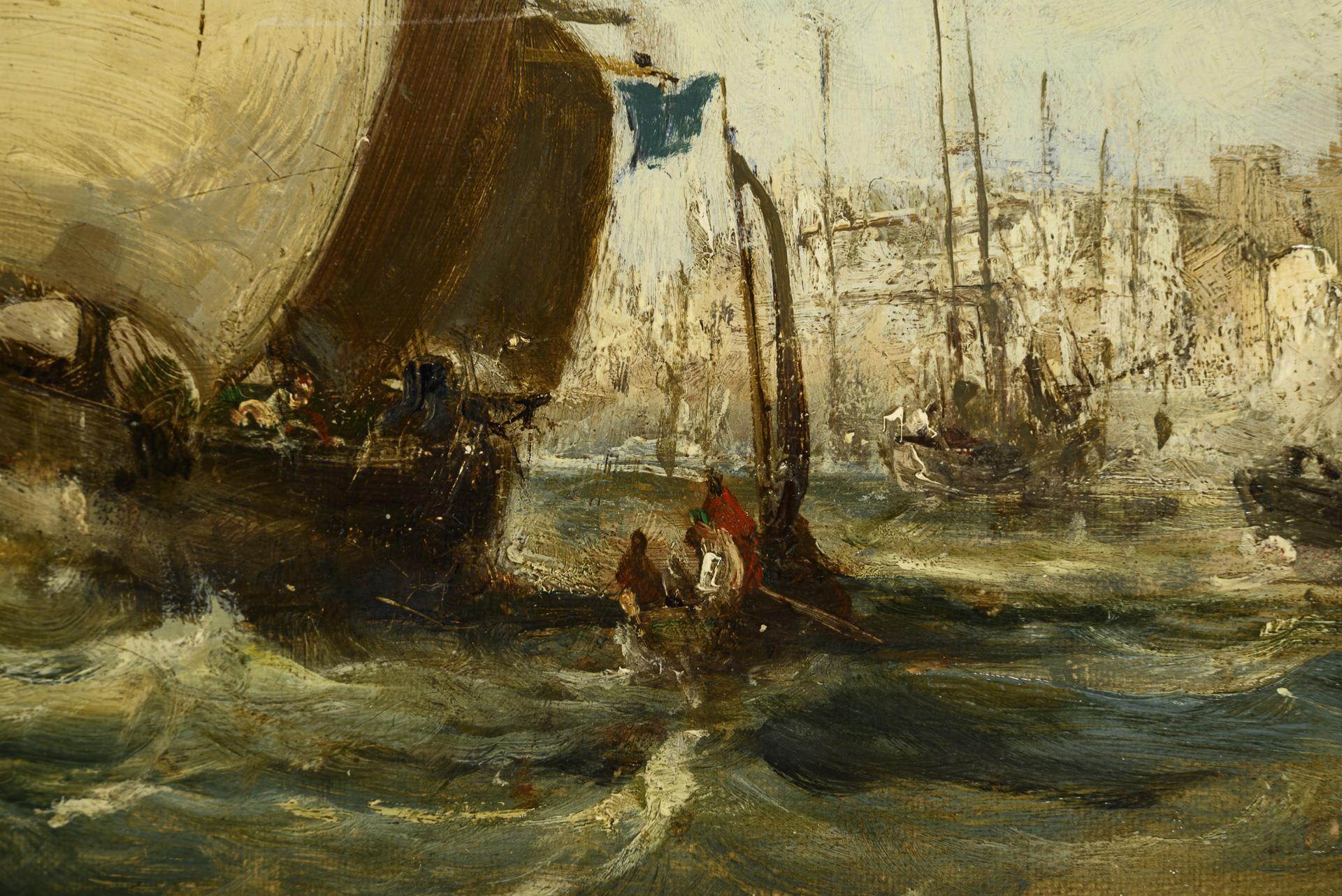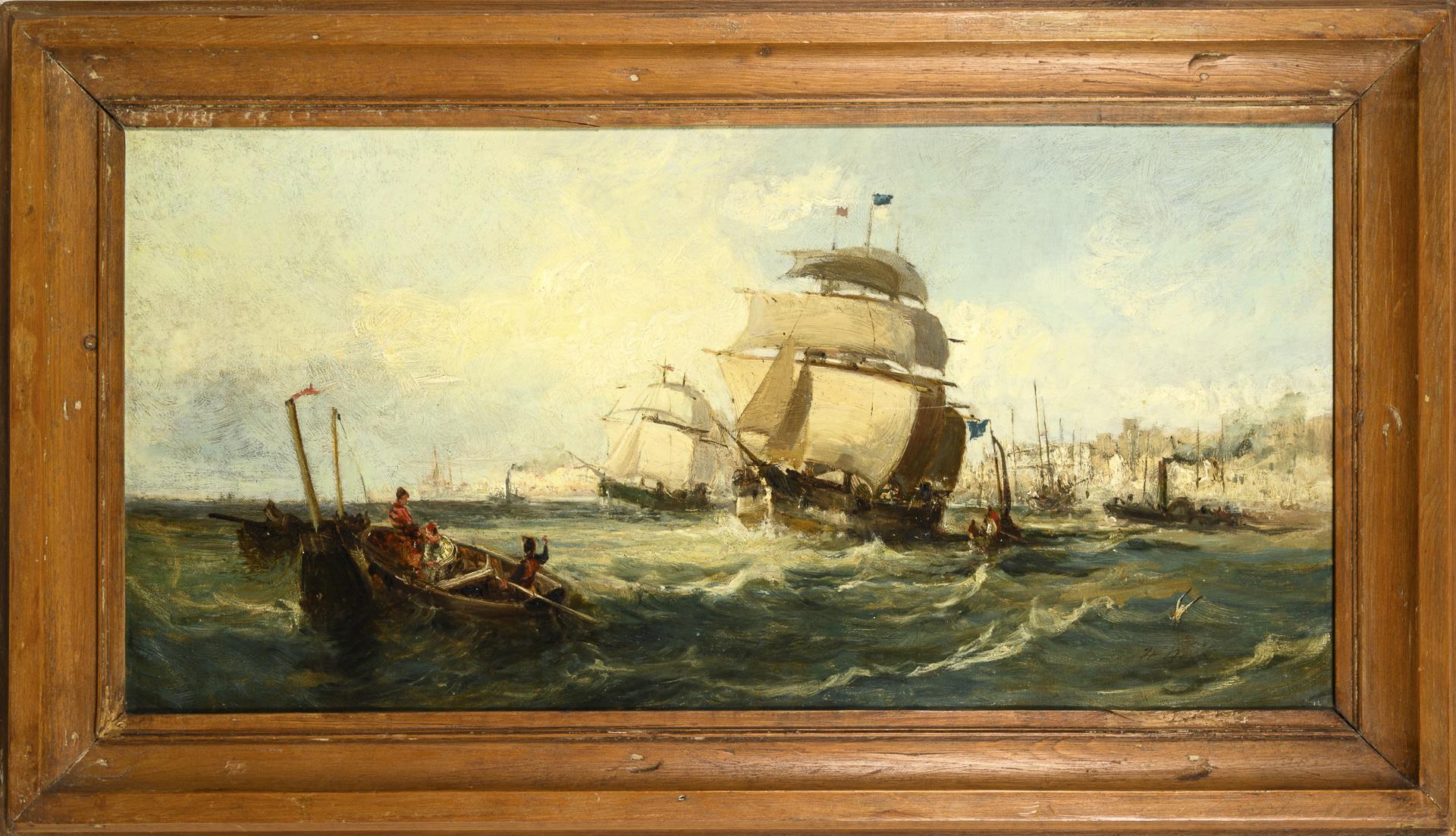 Mehrere Schiffe vor der Küstenstadt bei stärkerem Wellengang. Leinwand doubliert.