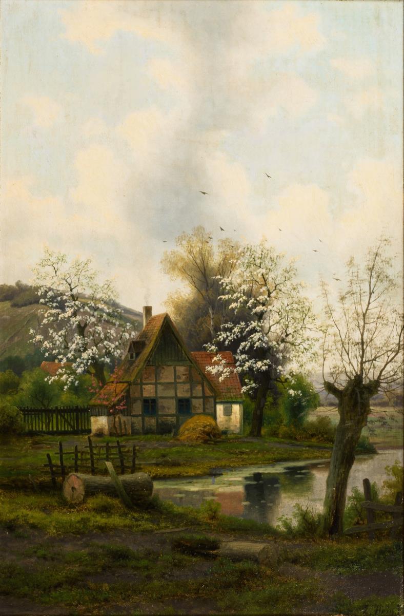 Bauerngehöft mit Teich und blühenden Obstbäumen unter wolkigem Himmel. Leichte Altersspuren.