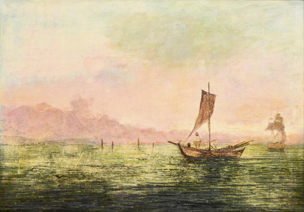 Fischerboot und Segelschiff am Morgen auf dem Wasser nahe der Küste unter dem rötlichen Himmel. Retuschiert.