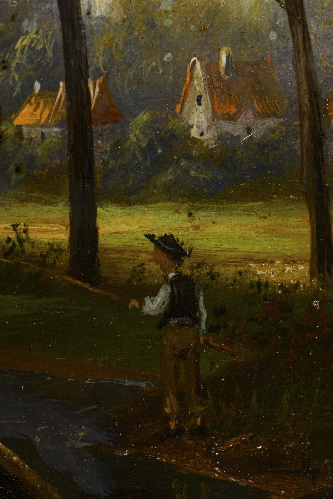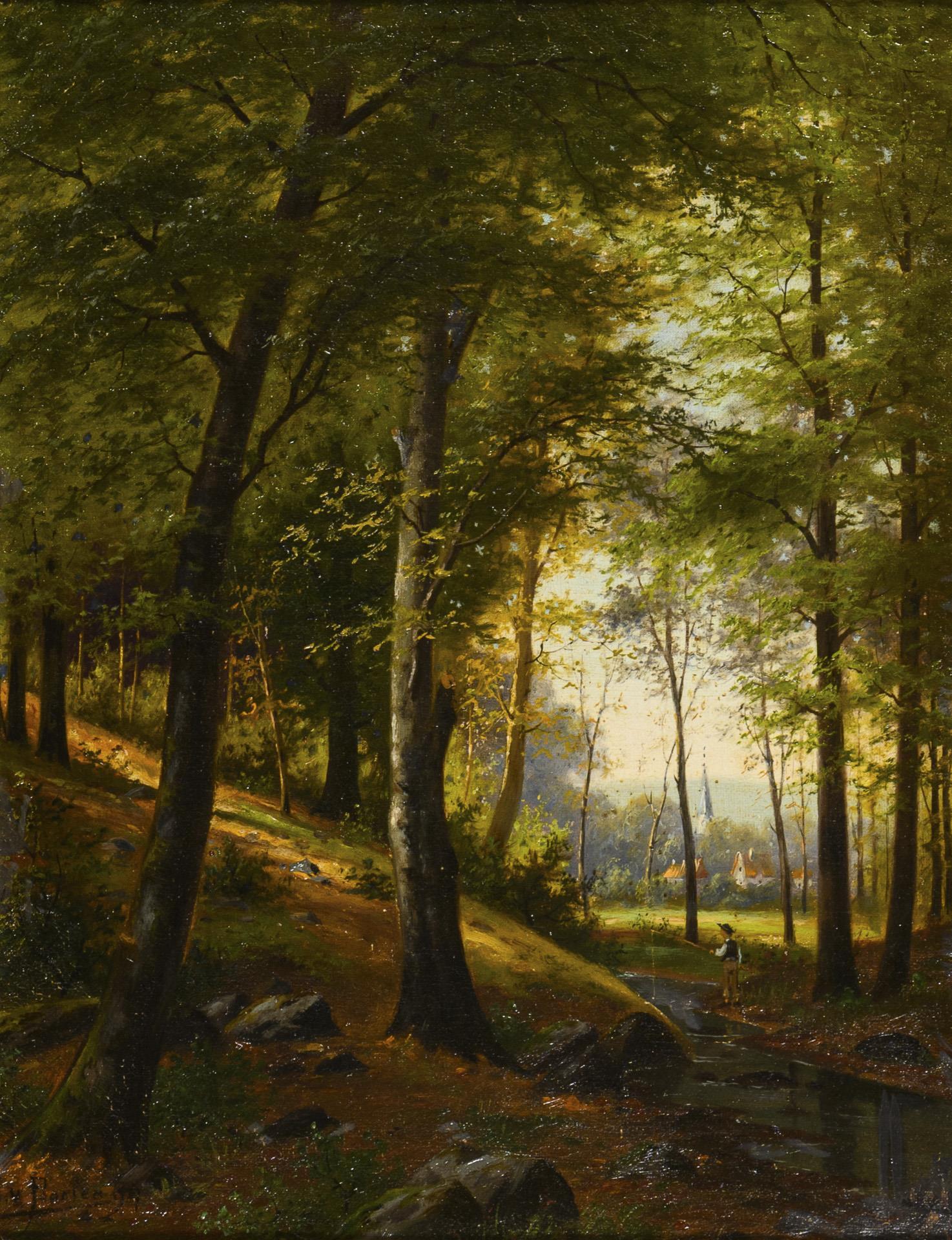 Waldhang mit einfallendem Sonnenlicht nahe dem Bach mit dem Angler. Leichte Altersspuren.