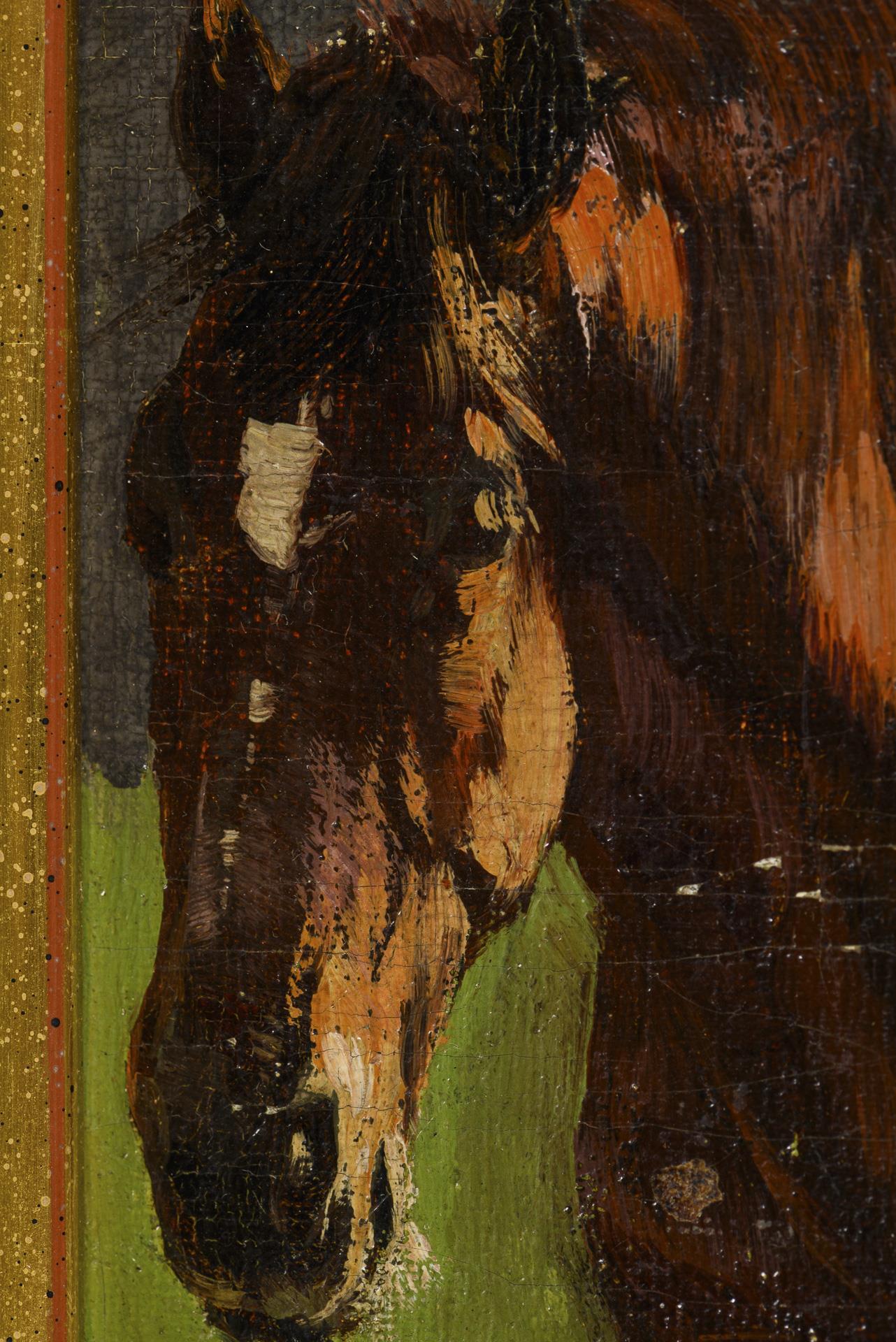 Braunes Pferd im hellen Sonnenschein auf der Wiese. Leichte Altersspuren.