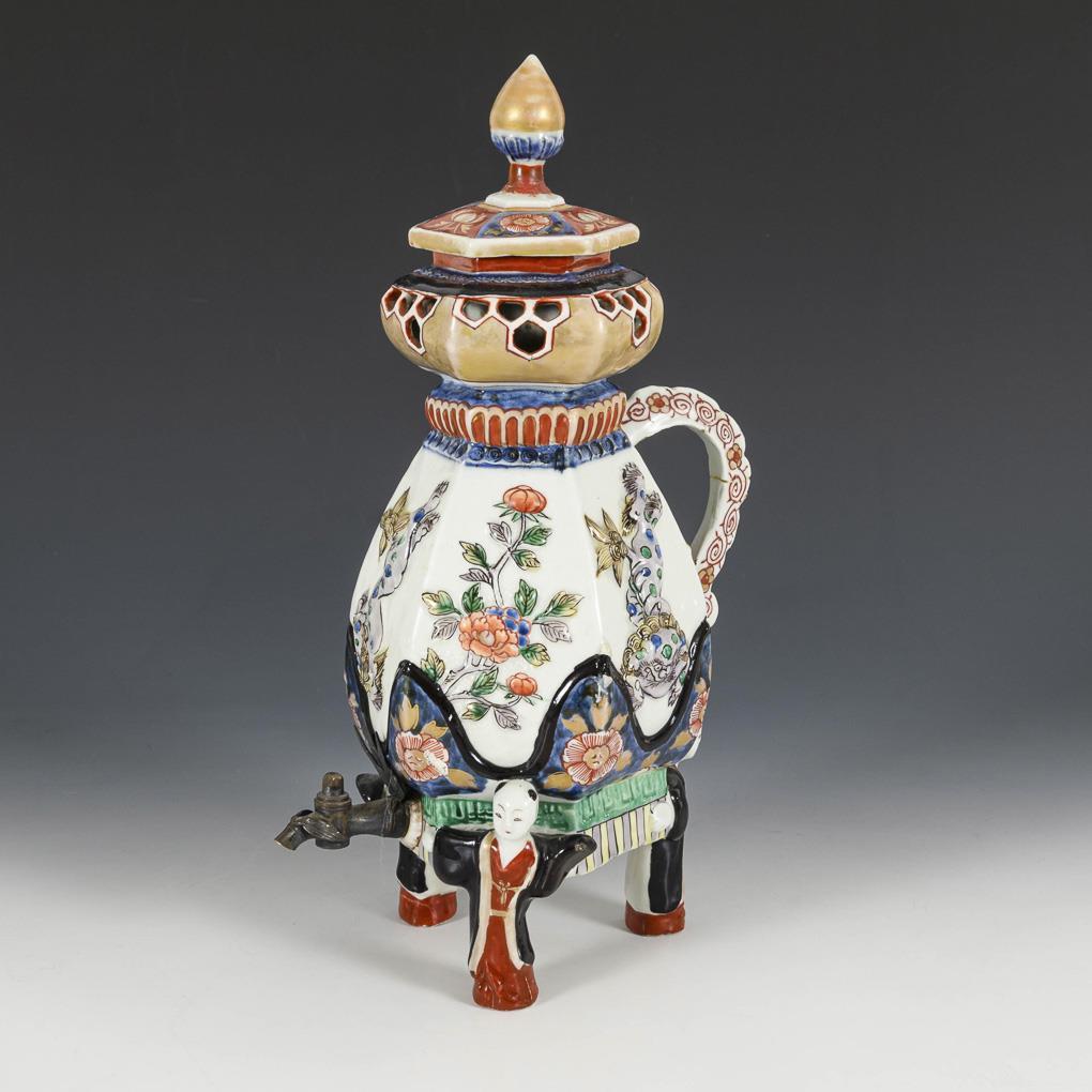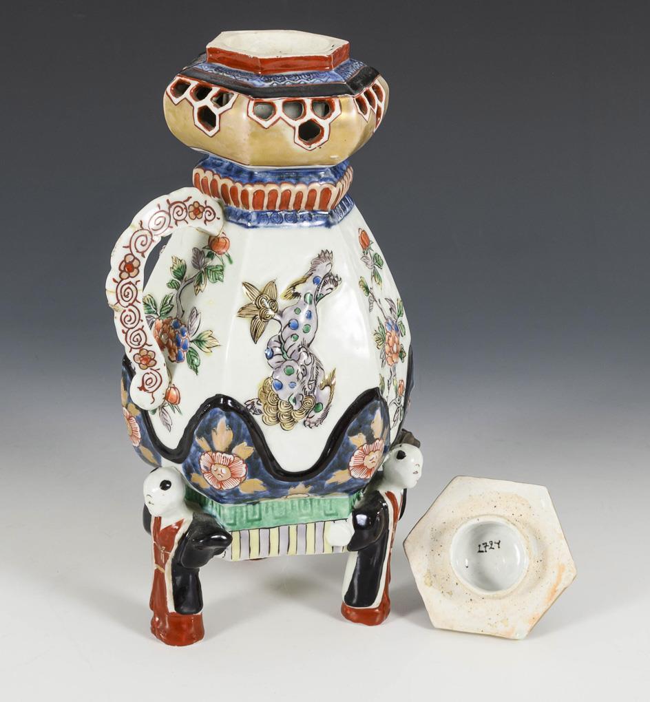 Imari Porzellan. Auf drei figürlichen Füßen stehende Kanne mit kleinem Messinghahn. Die sechskantige Wandung ist reliefiert und farbig gefasst in Unterglasurblau und polychromer Bemalung, mit Darstellungen von Blumen und Fabelwesen. Oberer Rand doppelwandig, mit wabenförmigen Durchbrüchen. Kleinere Brandrisse, Henkel und Knauf geklebt.