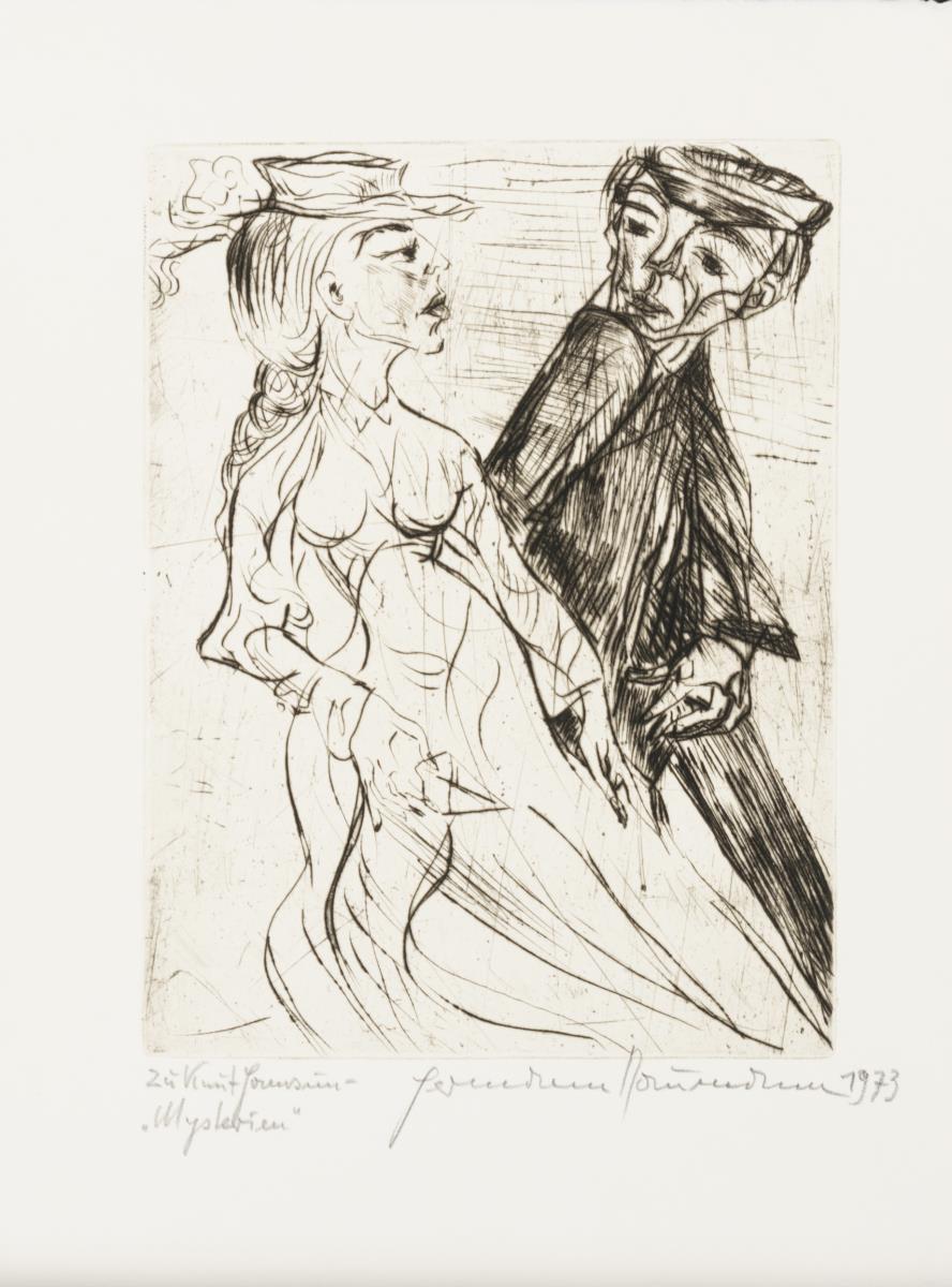 2 Blätter aus der Folge von 10 Radierungen zu den "Mysterien" von Knut Hamsun (1973).