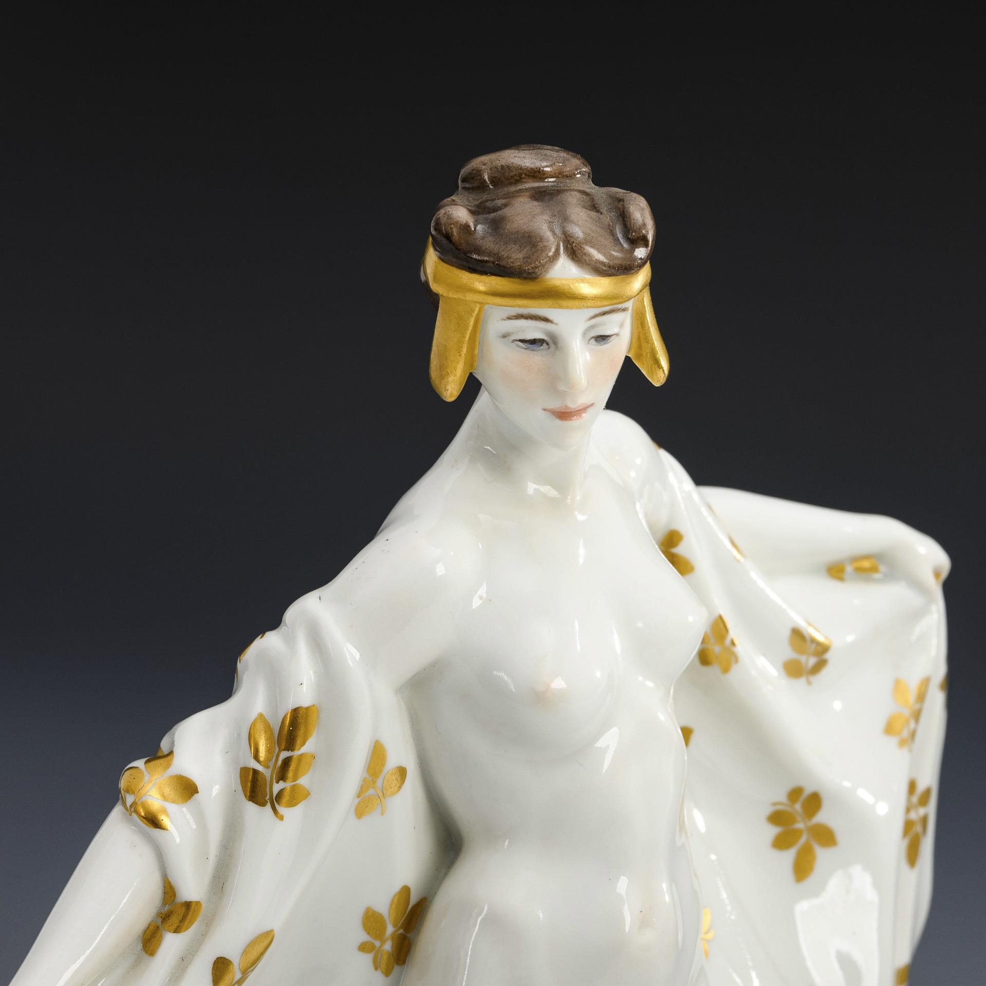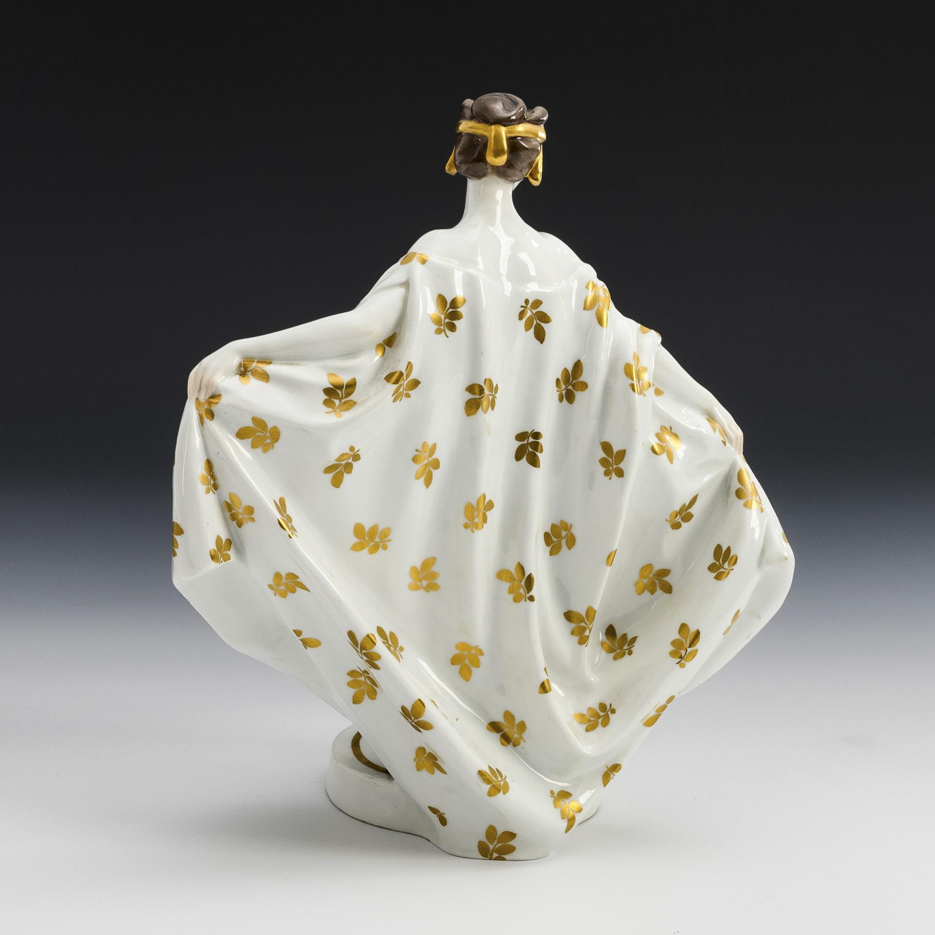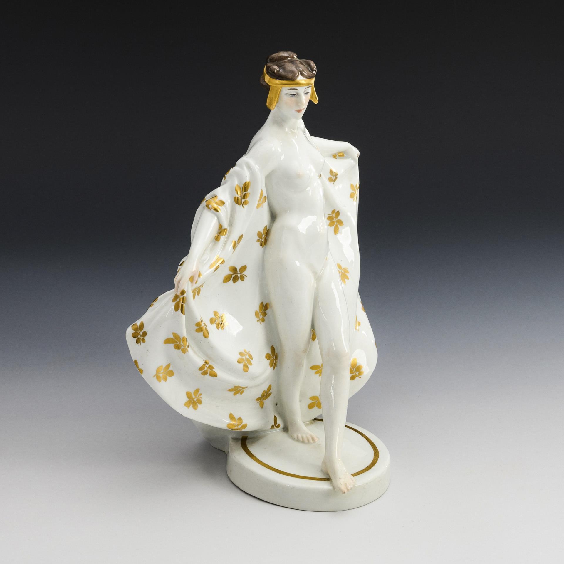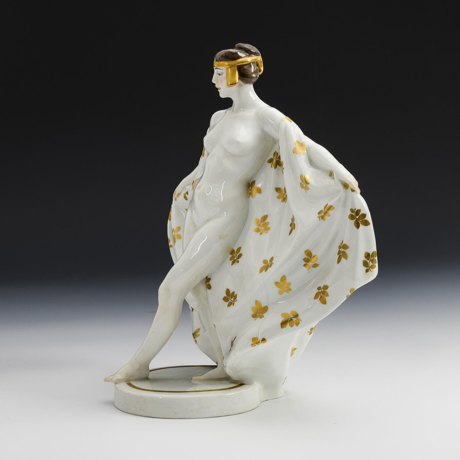Tanzender Frauenakt mit floral gemustertem Tuch. Linkes Bein restauriert, (herstellungsbedingt) ausgeschliffener und überdekorierter Brandfehler am Tuch, (herstellungsbedingt) feiner Brandriss unter der Glasur im Tuch.