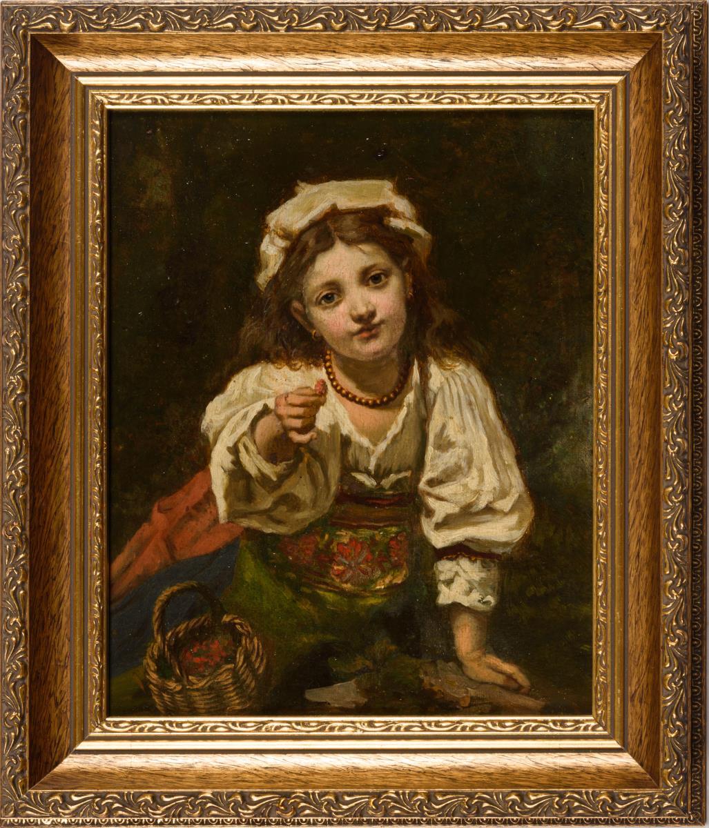 Qualitätvoll gemaltes Genrebild: Das hübsche Mädchen im Wald reicht dem Betrachter eine Beere. Minimal retuschiert.