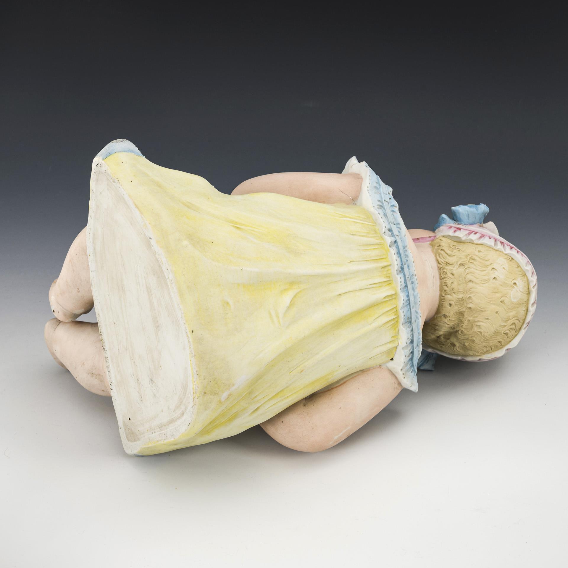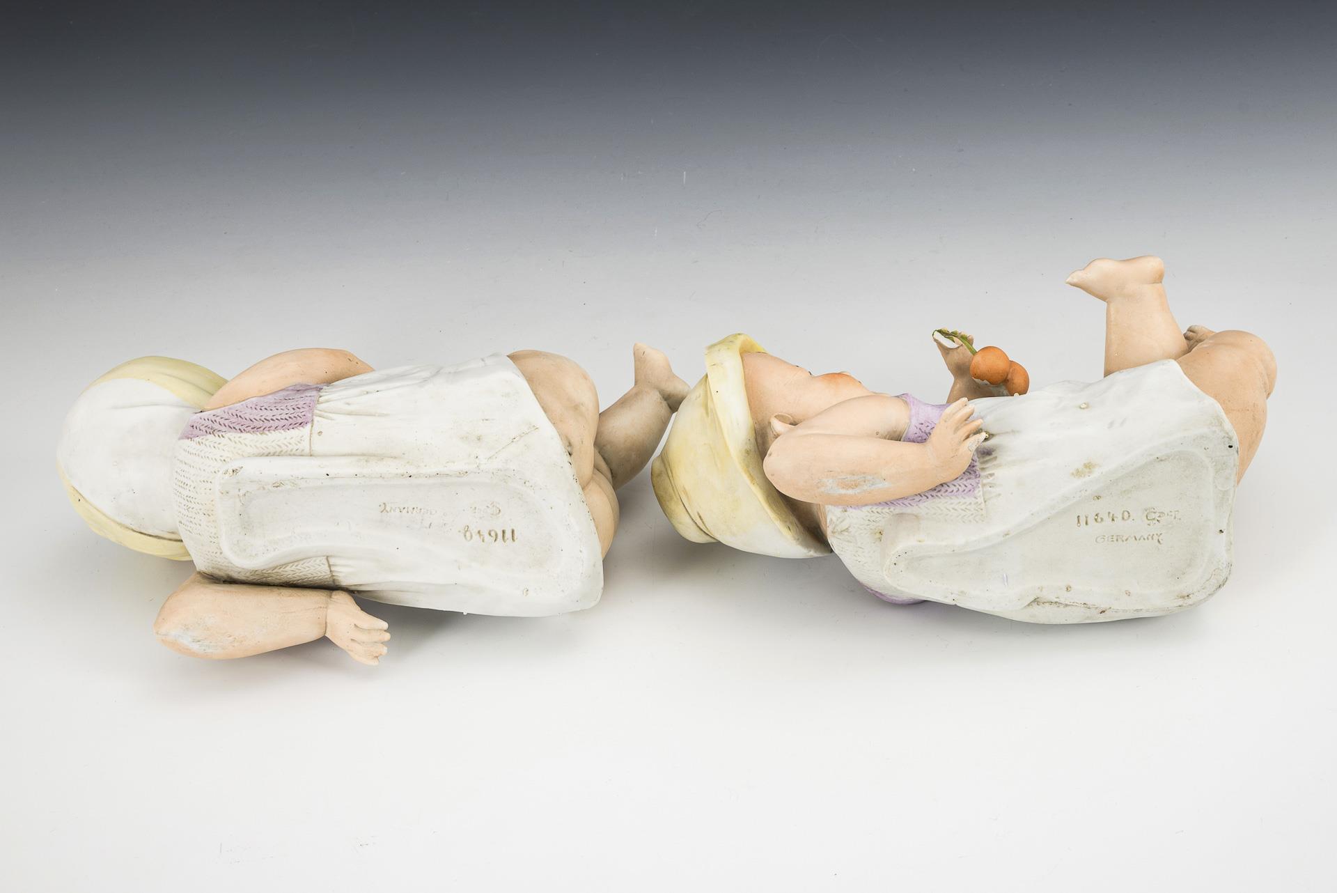 Großes, sitzendes Pianobaby mit Apfel. H 36,5 cm. 2 liegende Pianobaby-Figuren mit Früchten, als Junge und Mädchen. Je ca. 15 x 25 x 10 cm. Die kleinen Figuren mit einigen Bestoßungen. Die große Figur teils etwas brandrissig.
