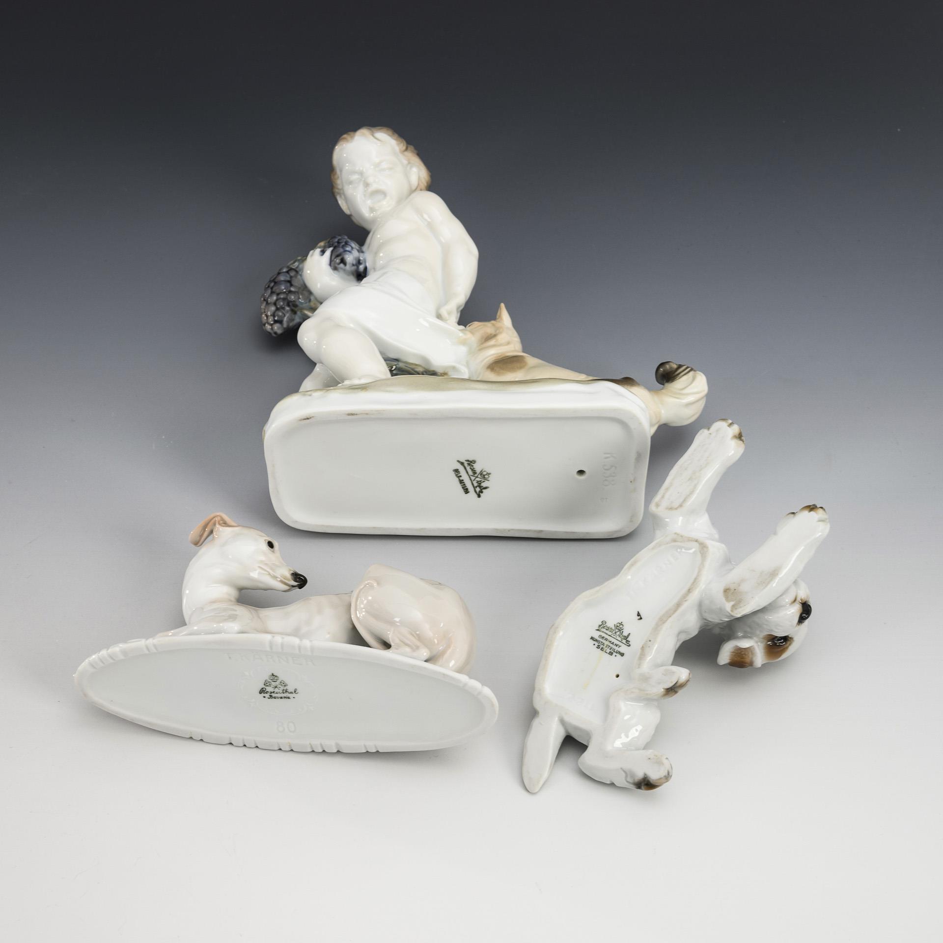 1x Modell-Nr. K 538, "Erwischt", Entwurf 1919 von Ferdinand Liebermann (1883-1941): Amor mit Trauben, der von einem Hund am Lendentuch festgehalten wird (H 22,5 cm). / 1x Modell-Nr. 80, Entwurf von Theodor Kärner (1884-1966): liegender Windhund (H 8,5 cm, L 16,5 cm). / 1x Modell-Nr. 1122, Entwurf von Theodor Kärner: liegender Welpe (H 5,5 cm, L 15,5 cm).