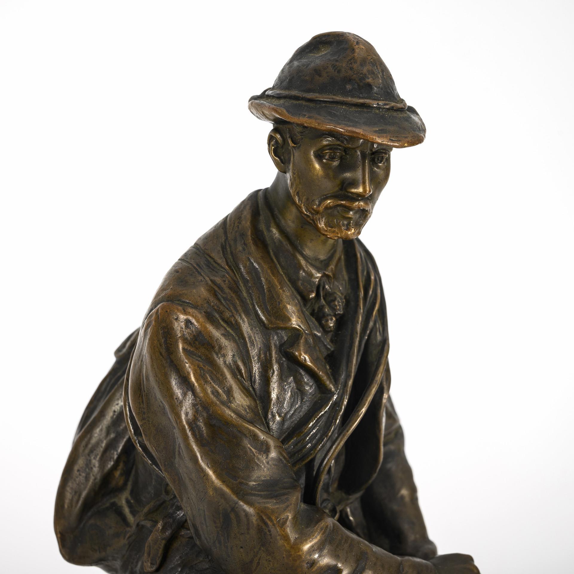 Vollplastische Figur des Mannes, der sich auf den Eispickel stützt, während das Seil über die Schulter geworfen ist. Bronze teils "Grünspan" angesetzt, minimaler Haarriss am Holz hinten.