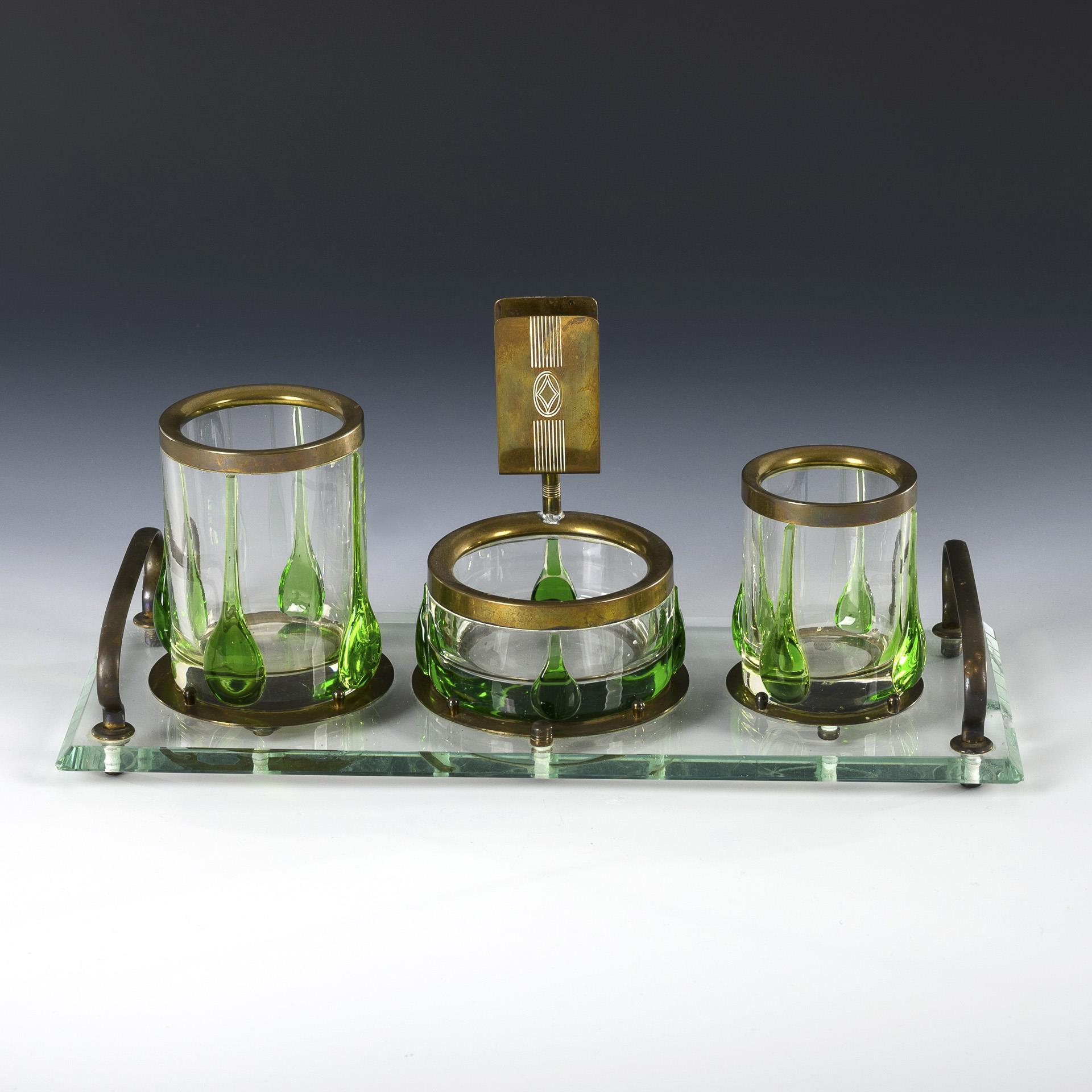 3 zylindrische Gefäße mit metallmontiertem Rand: Aschenbecher mit Halterung für die Streichholzschachtel (Ø 9 cm), Becher als Zigarettenbehälter (H 8 cm) und Becher als Zigarrenbehälter (H 10 cm). Rechteckiges Glastablett mit metallmontierten Henkeln und drei Standringen für die Gefäße (14 x 34 cm). Chip am Rand der Glasplatte, Ecken der Glasplatte bestoßen, Halterung für die Streichholzschachtel gelötet.