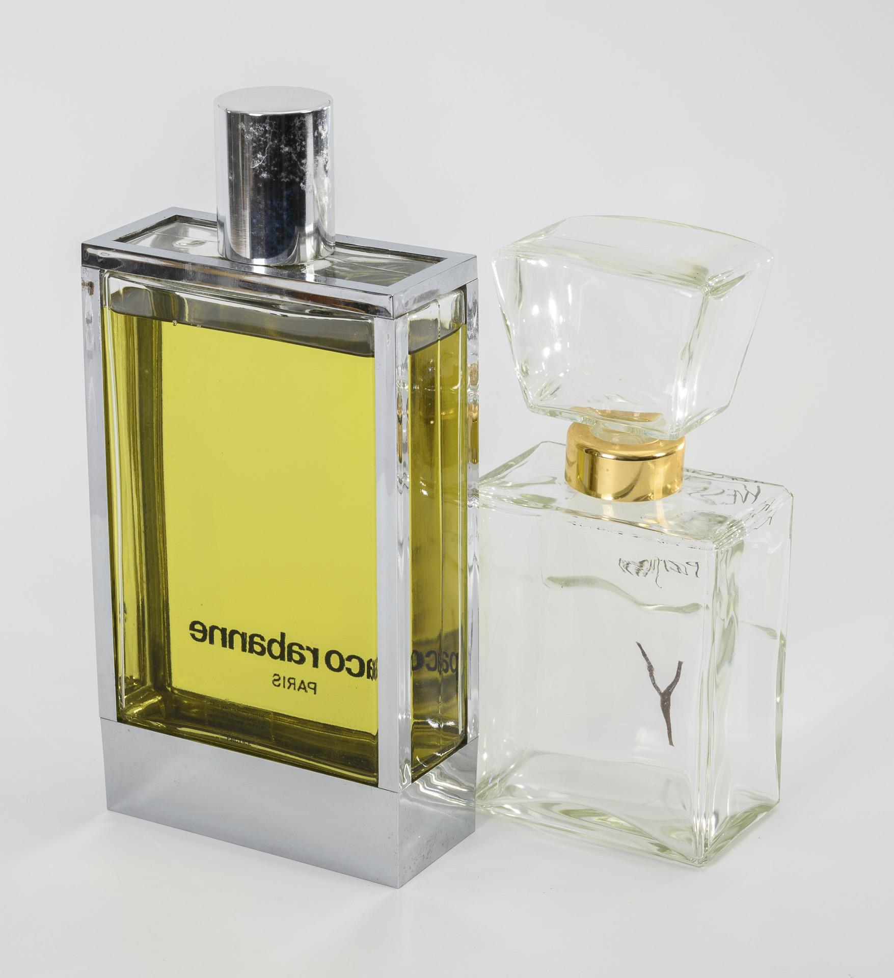 "À-cage"-Flasche mit Metallrahmung; auf der Wandung Aufdruck "calandre", "paco rabanne Paris". / Leere Flasche mit großem Hohlglasstöpsel und goldfarbener Halsmanschette; auf der Wandung goldfarbene Aufschrift "Yves Saint Laurent Parfum".