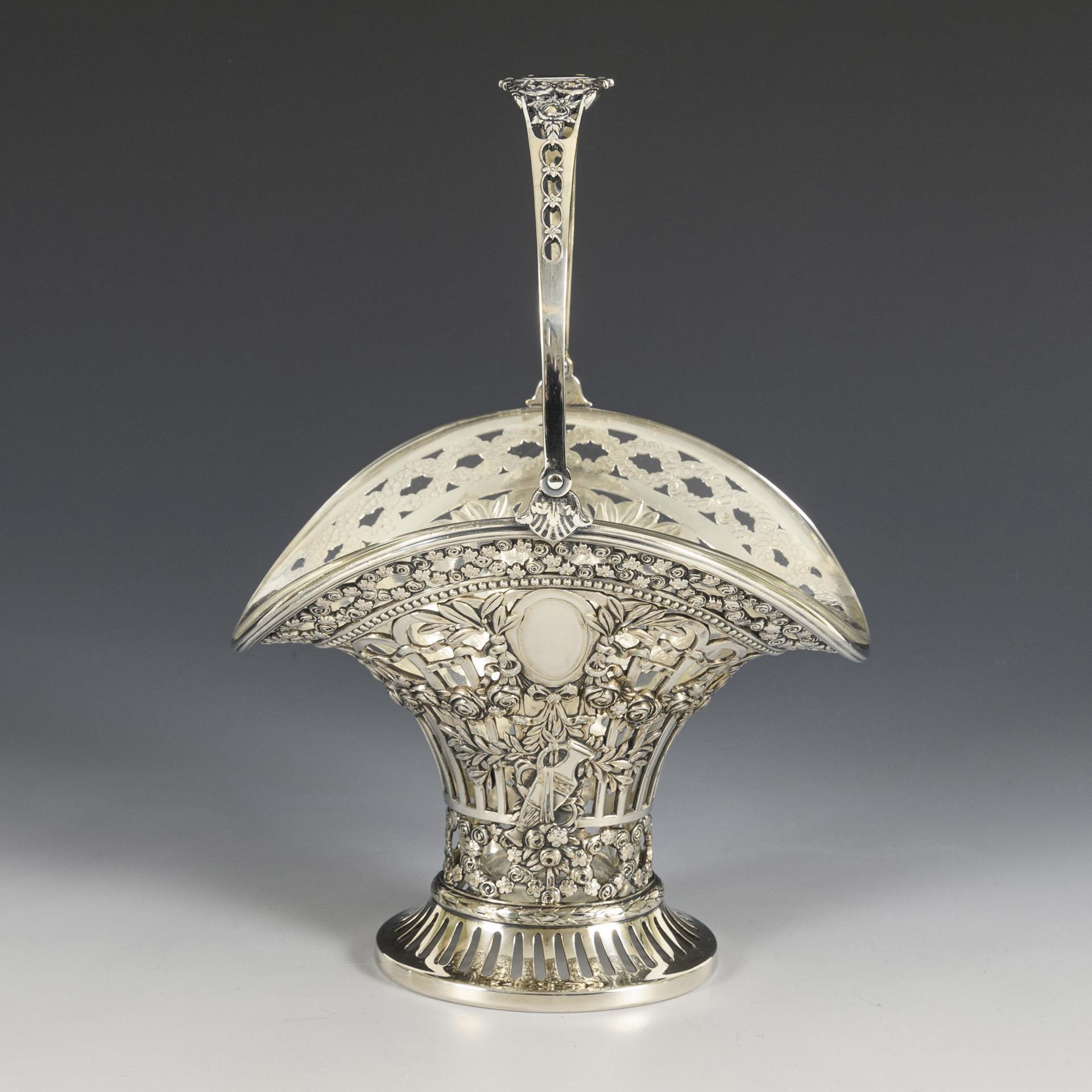 Durchbrochen gearbeiteter, mit Rosenreliefs verzierter Korb mit Scharnierhenkel. 1 winziger Randchip am Glas.