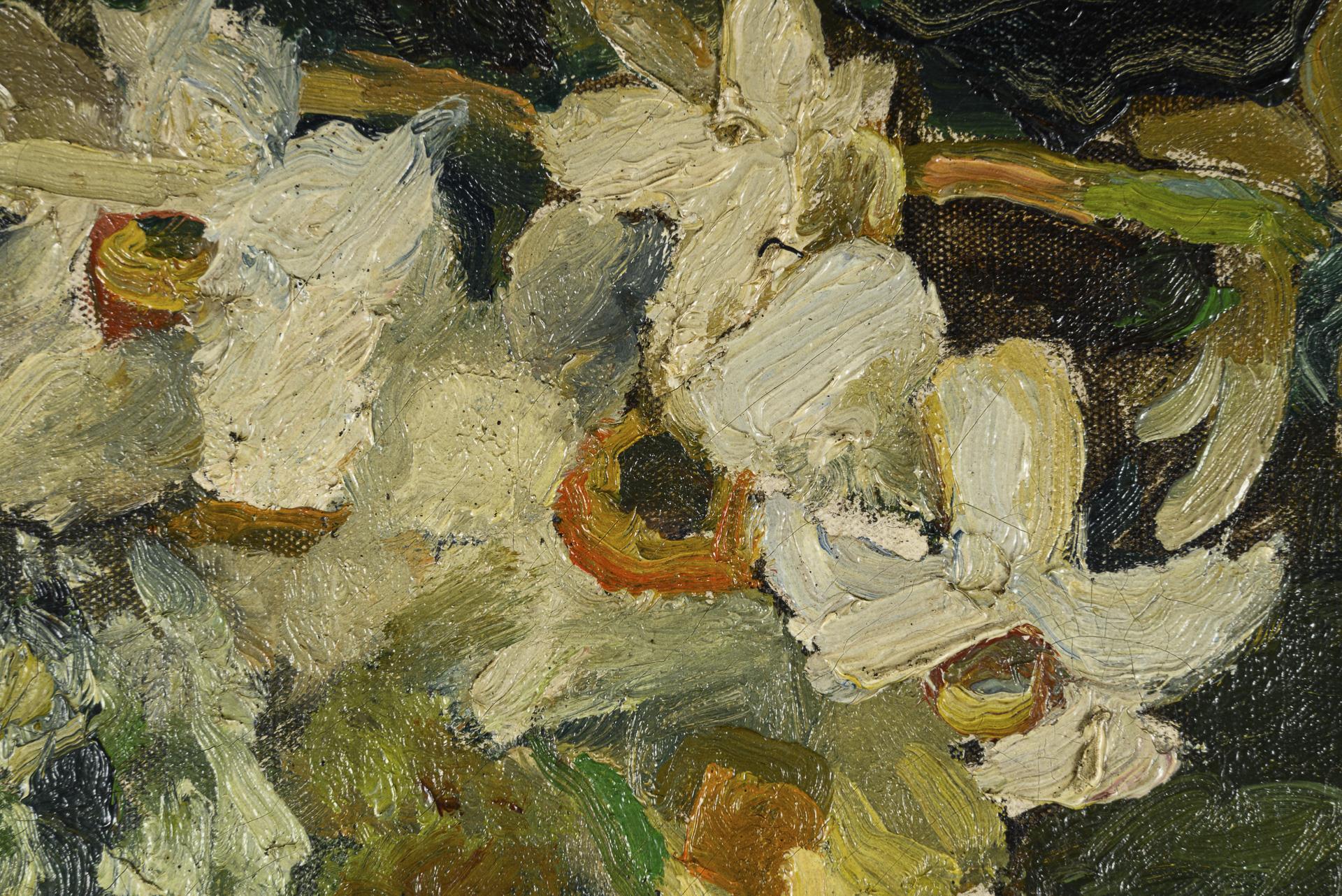 Lilien, Tulpen und Narzissen in einer stiefelförmigen Vase. Altersspuren.
