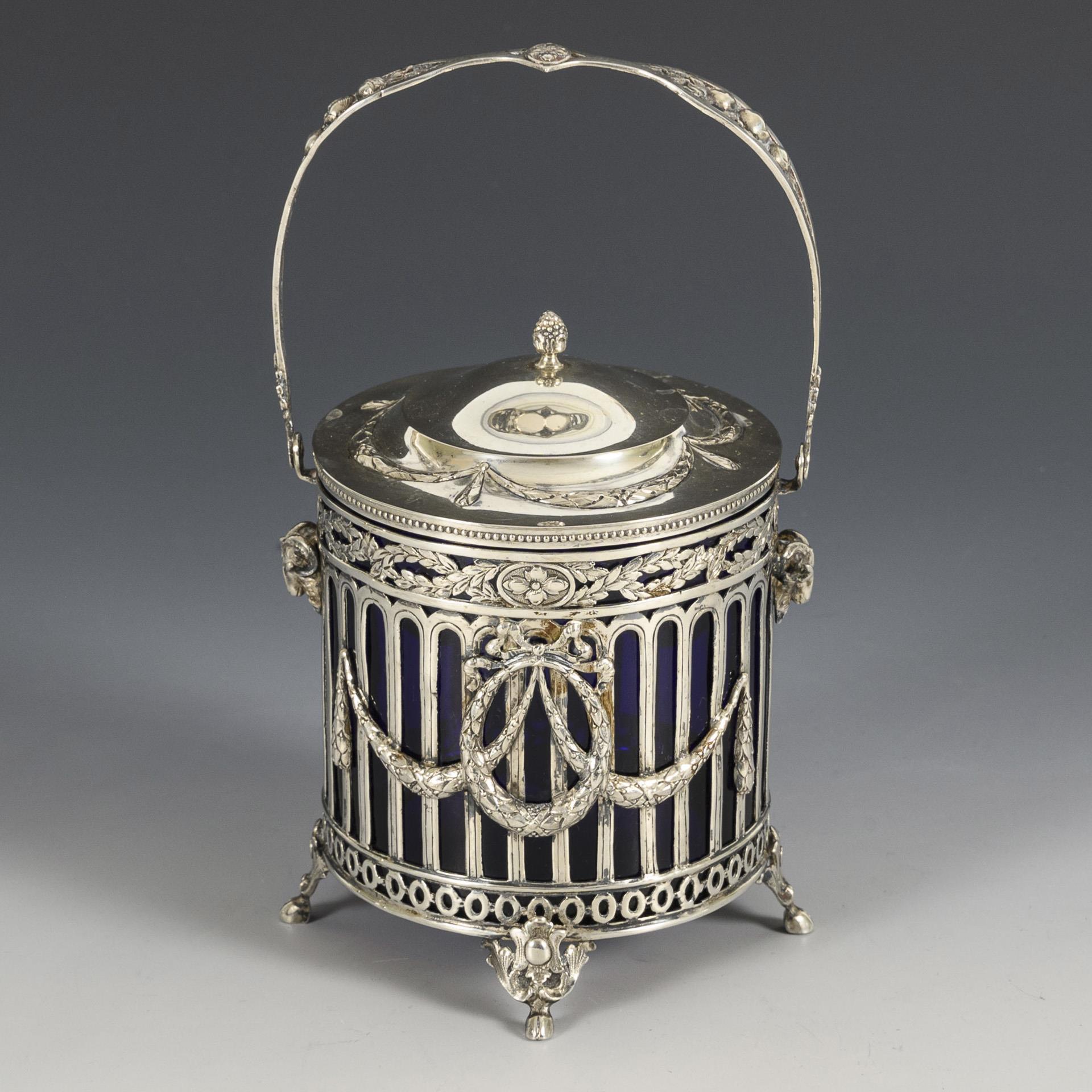 Runde Henkeldose mit Kobaltglaseinsatz. Ferdinand C. Henzler, Hanau.