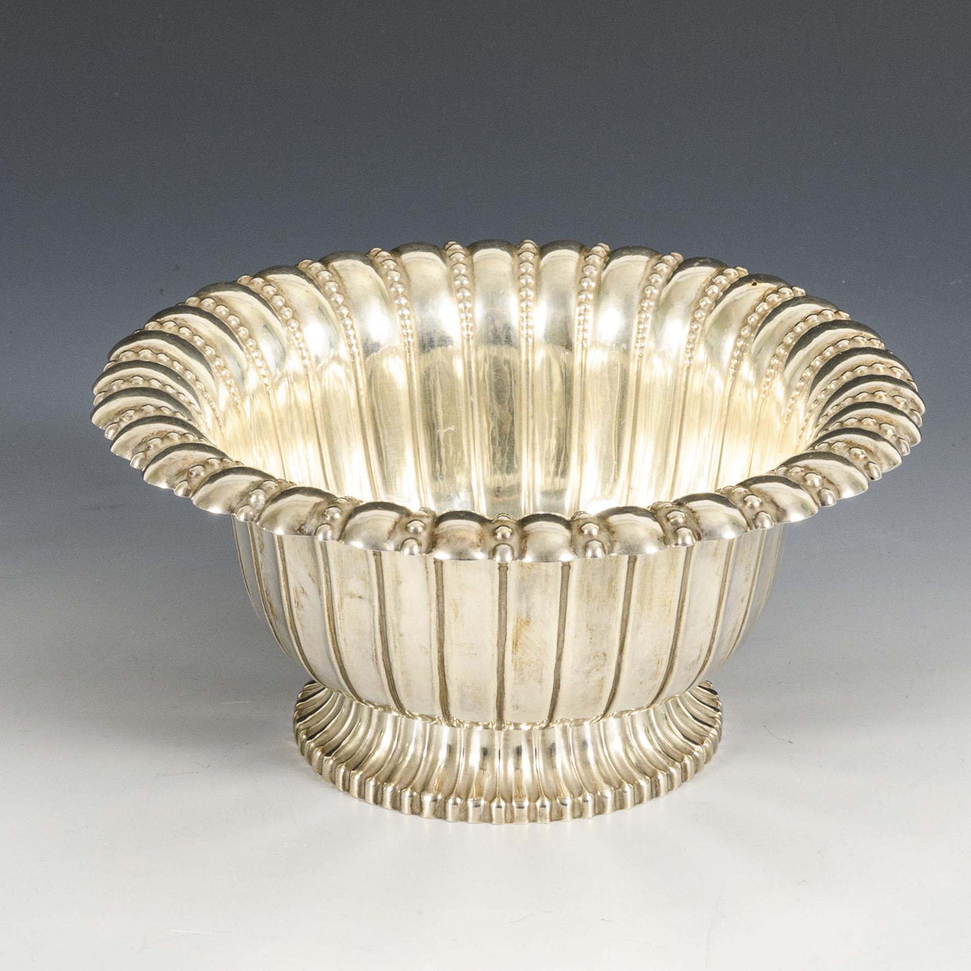 Runde Schale mit gerippter Wandung und Perlbändern, in der Art des Wiener Jugendstils. Gebrauchsspuren (Kratzer und kleine Dellen).