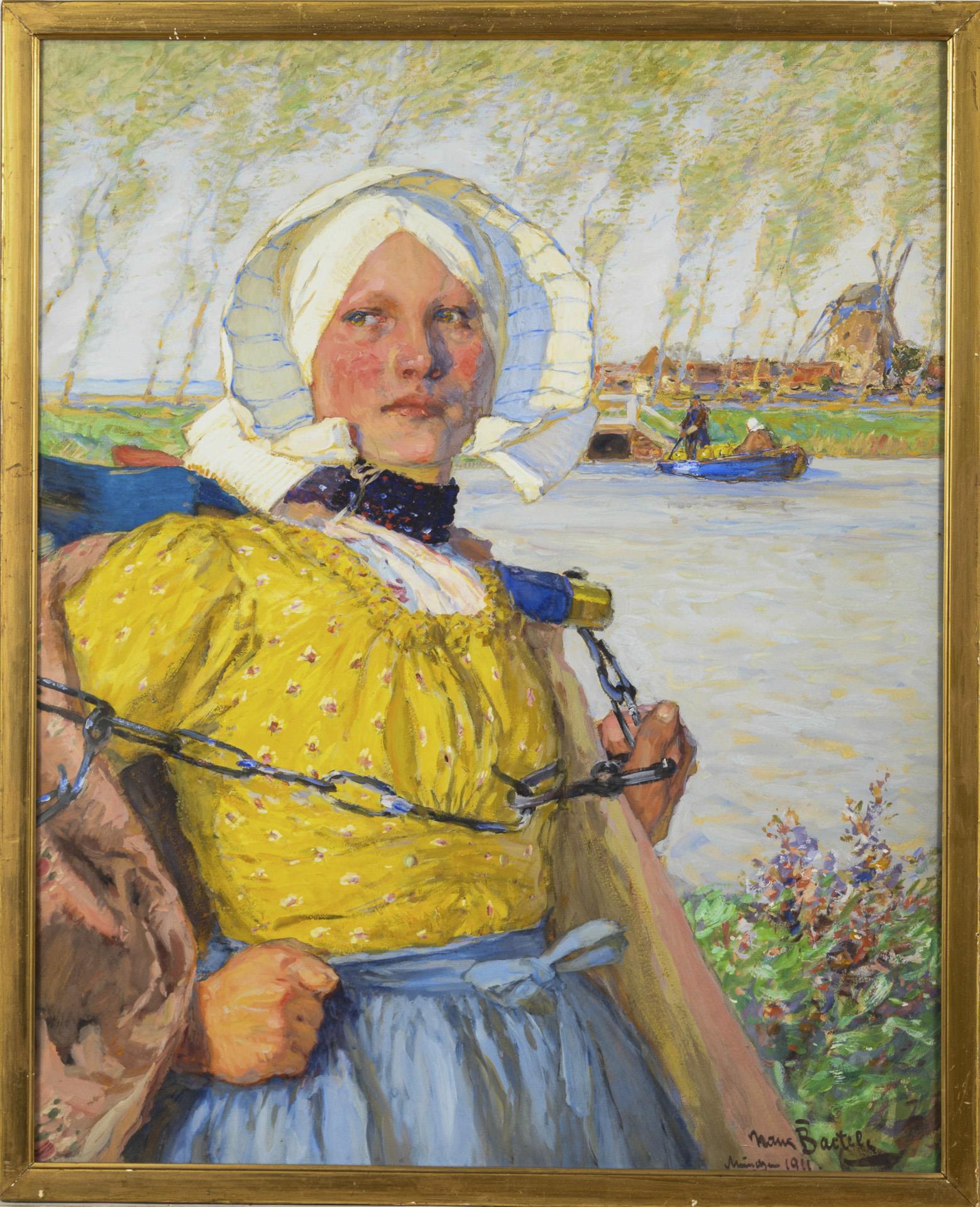 Junge Holländerin in gelb-blauem Kleid im hellen Sonnenschein am Fluss.