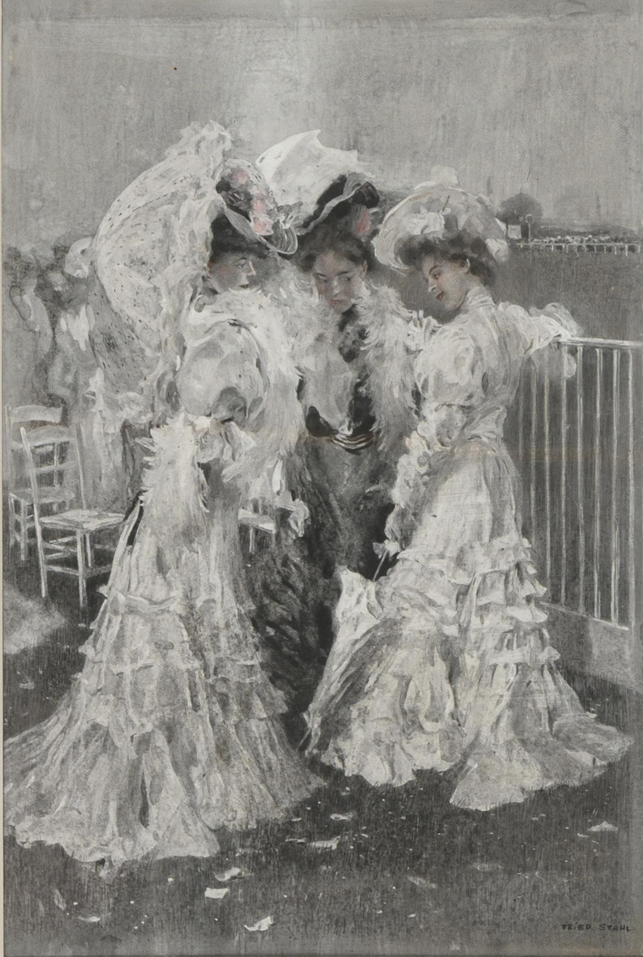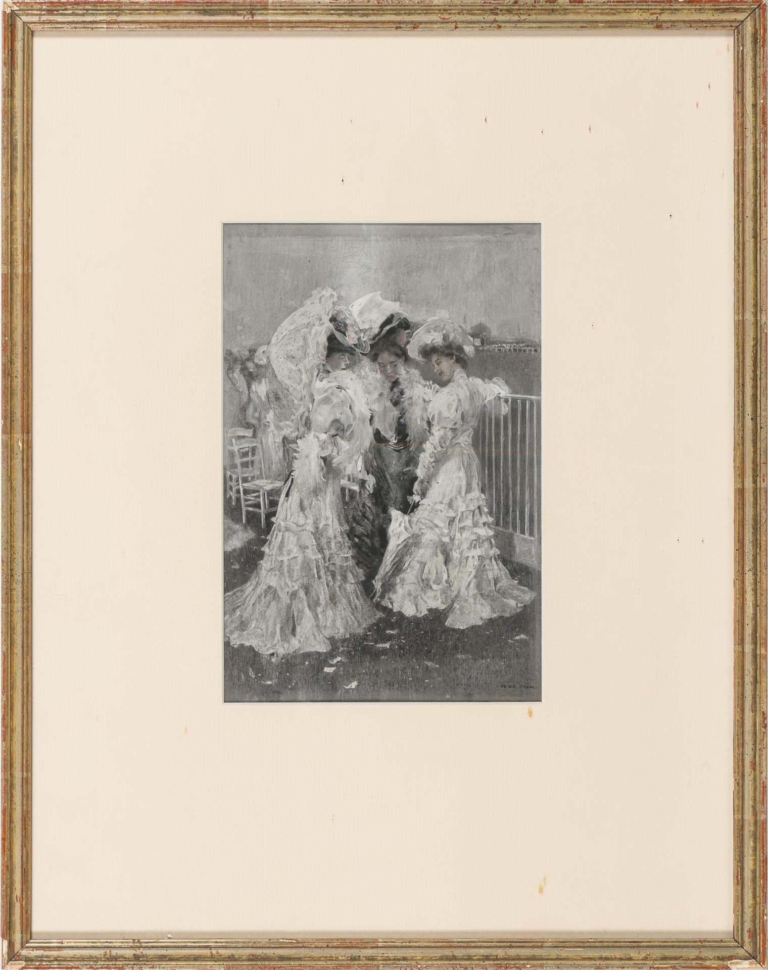 Jugendstilgemälde mit drei jungen Damen im Gespräch an einem Zaun.