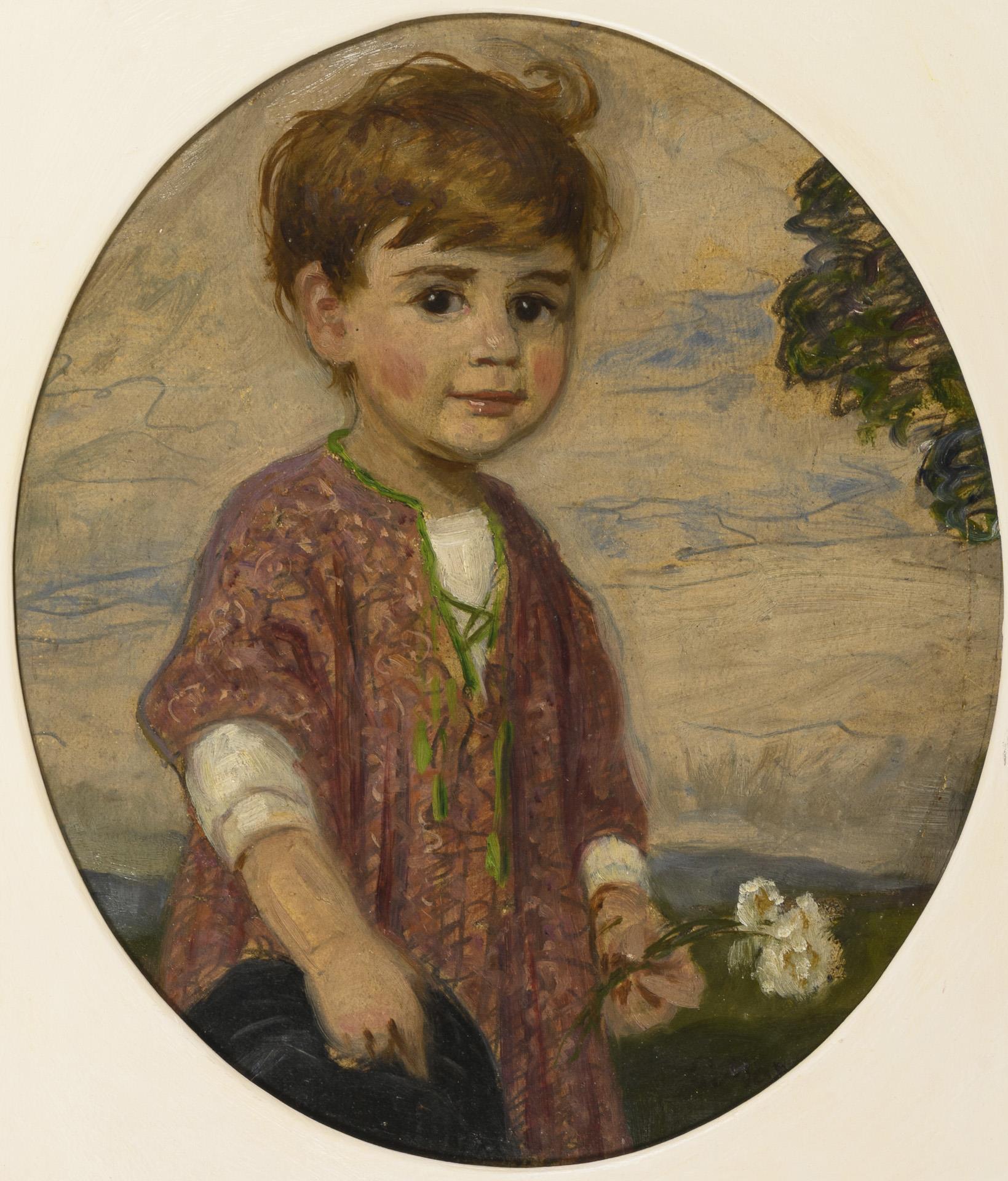 Porträt eines Jungen vor bergiger Landschaft mit Blumen in der Hand.