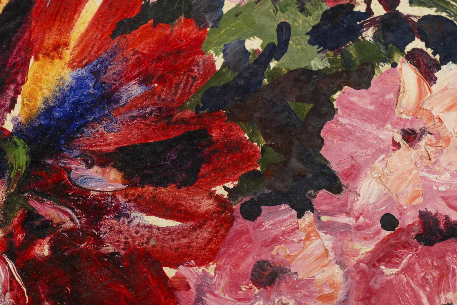 Bunter Blumenstrauß mit großen leuchtenden Blüten in breiter Vase. Kleine Defekte am Rahmen.