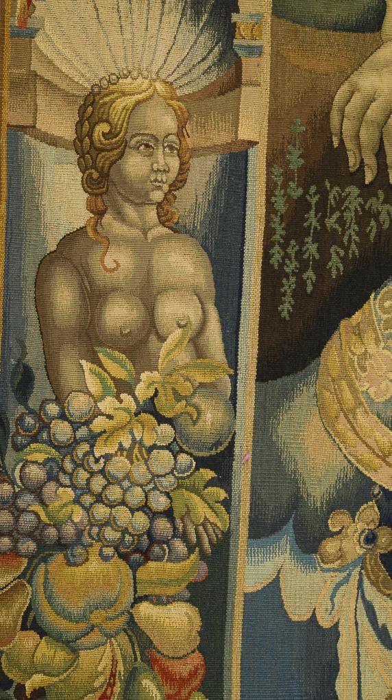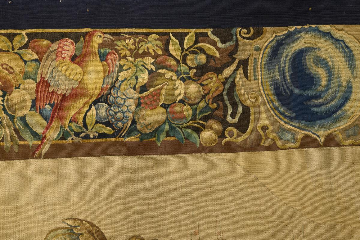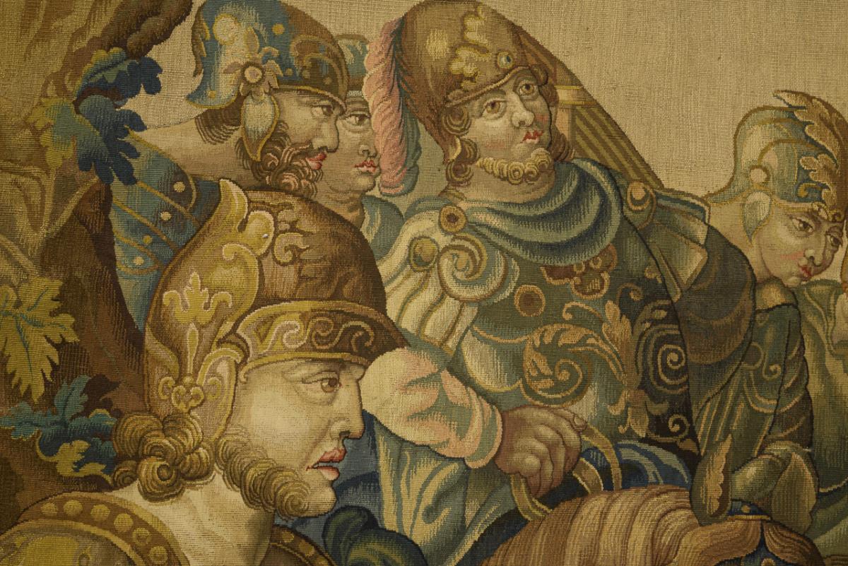 Feine Bildwirkerei mit historisierender, vielfiguriger Antikenszene. Im Zentrum zwei lorbeerbekränzte Heerführer beim symbolischen Handschlag, wohl der junge makedonische König Alexander der Große und der persische Großkönig Dareios III., umgeben von Soldaten, Pferden und Frauenfiguren. Im Hintergrund eine Schiffsflotte und die Ansicht einer Küstenstadt mit vorgelagertem Heer. Bordüre mit üppigem Früchtedekor, Vögeln und Postamenten mit Frauenfiguren.