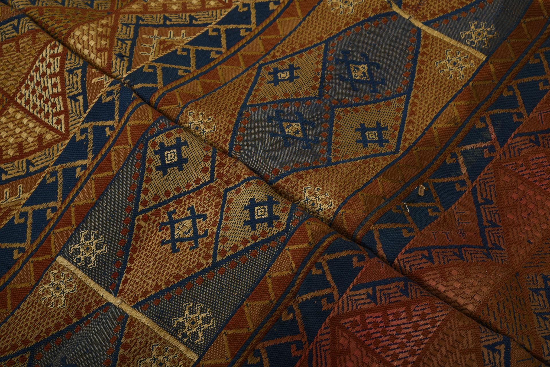 Aus einzelnen Gewebestreifen zusammengesetztes Flachgewebe in Kilim-Technik, in Naturfarben eingefärbte Wolle. Ca. 120 x 328 cm, 119 x 324 cm, 122 x 340 cm.
