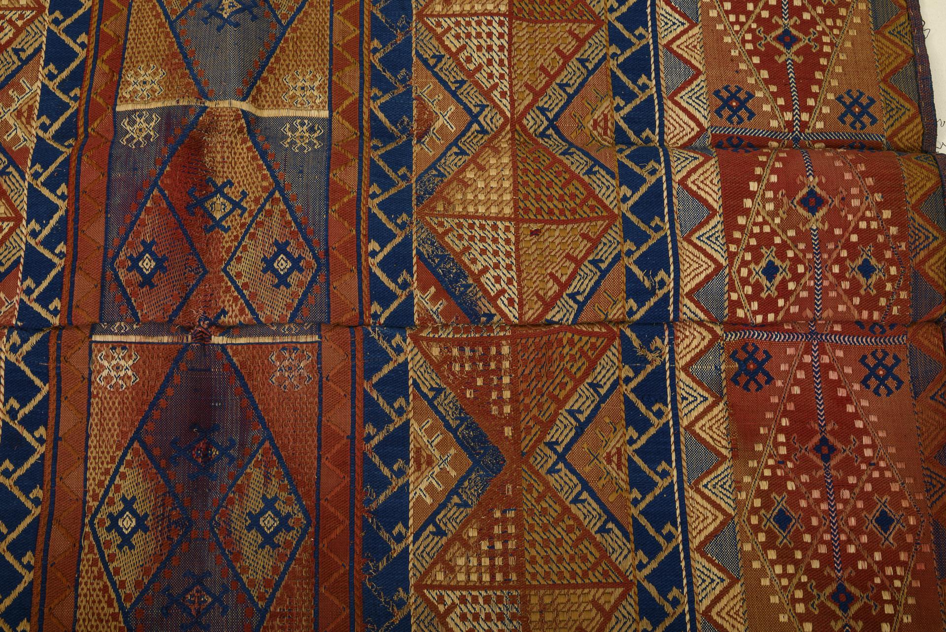 Aus einzelnen Gewebestreifen zusammengesetztes Flachgewebe in Kilim-Technik, in Naturfarben eingefärbte Wolle. Ca. 120 x 68 cm, 119 x 327 cm, 119 x 330 cm.