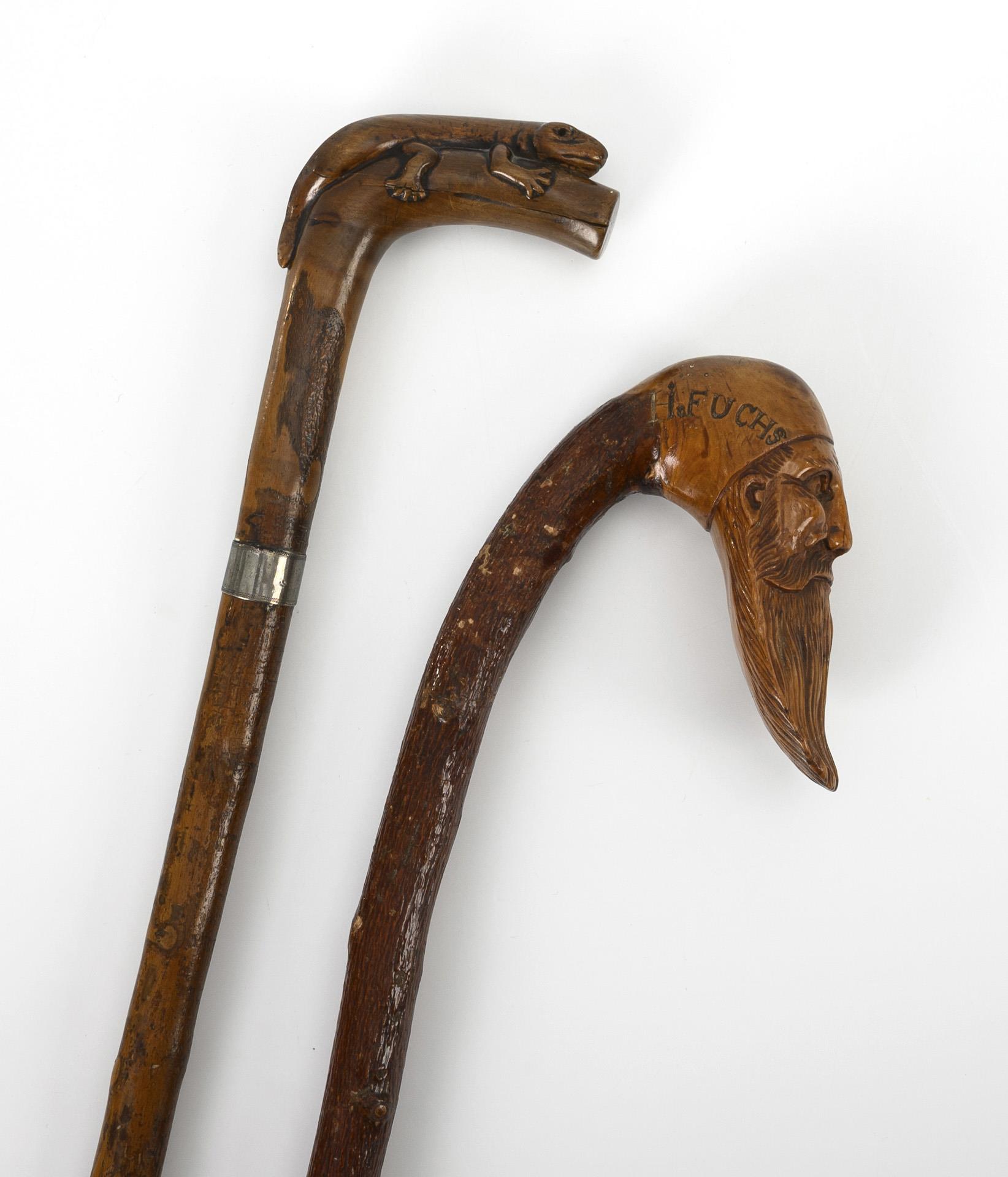 Aus einem Stück gefertigter Stock mit freundlich blickendem bärtigen Kopf als Knauf; "Hi. Fuchs" signiert. Knotiger Schuss mit Naturrinde und großer Eisenzwinge. / Zusammen mit dem Winkelhakenknauf geschnitzte, nahezu volllplastische Eidechse sowie versilberte Manschette. Schuss mit Naturrinde und Astansätzen sowie gerundeter Eisen-"Spitze" an der Messingzwinge. Je kleinere Fehlstellen an der Rinde, Knotenstock mit Trockenrissen auch am Knauf.