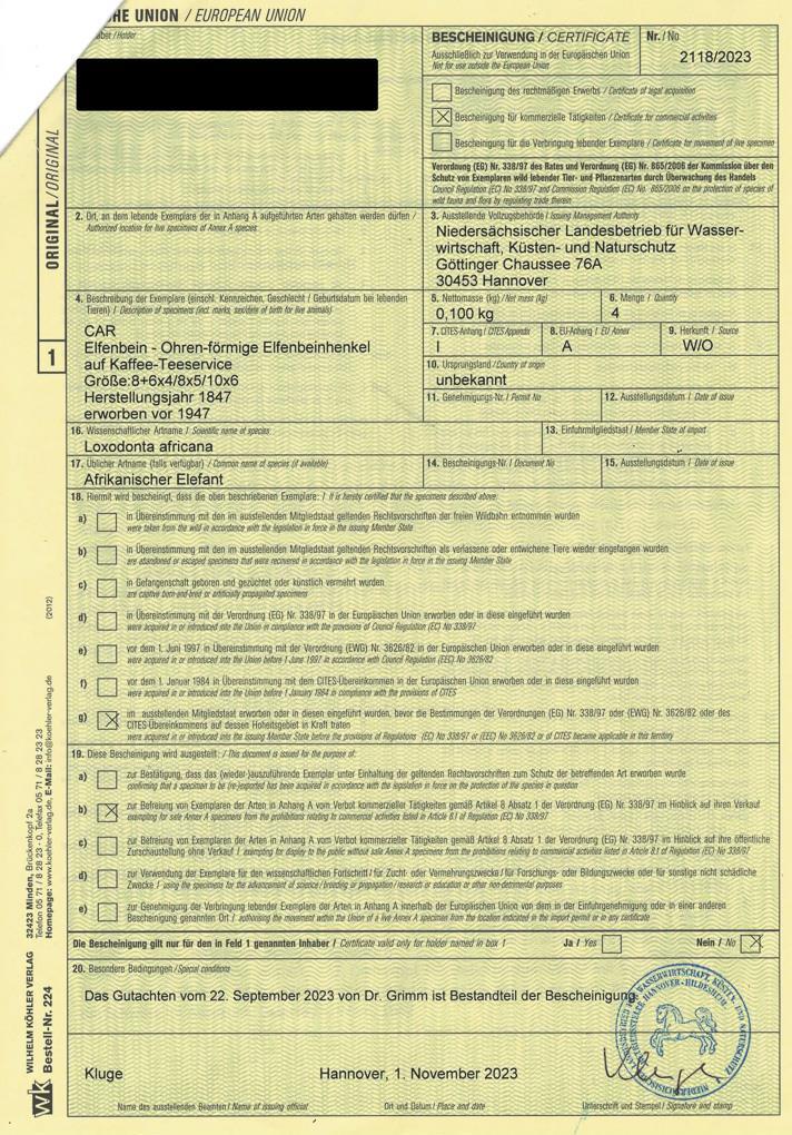 Alle Elfenbeinlose der Auktion werden mit CITES-Dokumenten inkl. fortlaufender Handelsgenehmigung innerhalb der EU versteigert. All ivory lots in this auction are sold with the necessary CITES documents confirming continuous trading permits within the EU. Please note that this lot contains elephant ivory; the export of which outside the EU is now prohibited! Prospective purchasers should familiarize themselves with relevant customs regulations prior to bidding if they intend to import this lot into another country.