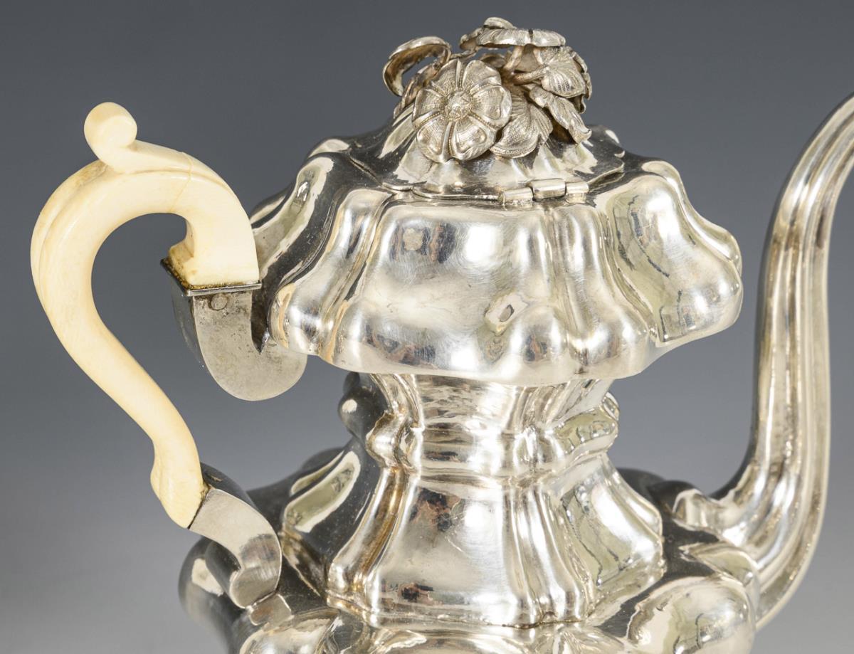Gedrängte Balusterform mit Elfenbeinhenkeln und plastischen Blütenknäufen: große Teekanne, sowie Kaffee-, Mokka- und Wasserkanne. Einige Dellen und Reparaturstellen. Griffe mit feinen Trockenrissen, 1x geklebt.