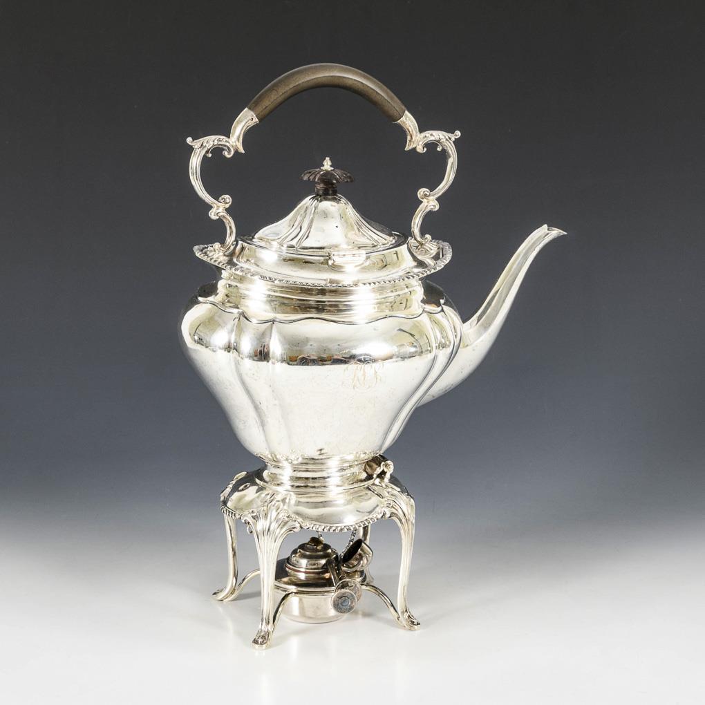 Elegante Teekanne mit Monogrammgravur "RSS", feststehendem Bügelhenkel und Holzgriff. Mittels Scharnier am Rechaud befestigt. Korpus gedellt.