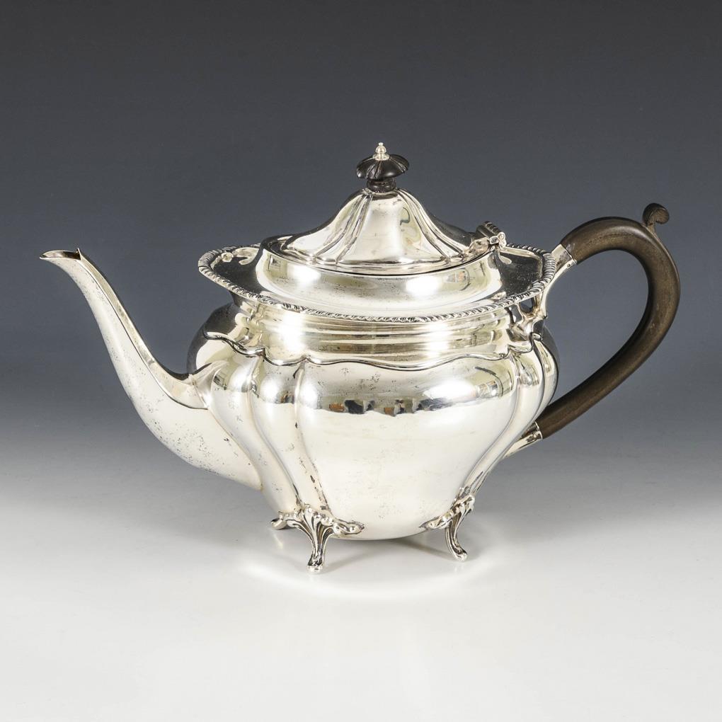 Bauchige Teekanne mit gerippter Kante, Monogrammgravur "RSS" und dunklem Holzgriff. Einige kleine Dellen, an der Tülle stärker gedellt.