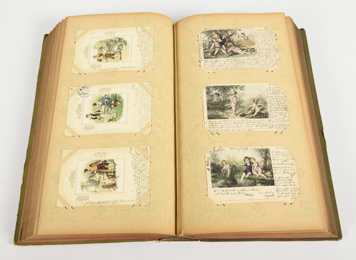 Ca. 480 Karten, die alle an eine Adresse in Magdeburg gelaufen sind. Teils Chromolithografien, teils geprägt. Zumeist Genrebilder (häufig nach Gemälden), Tier- und Kinderdarstellungen, idyllische Landschaften, Blumen, einige Stadtansichten, wenige Schauspieler- und Dichterporträts. Lindgrüner Ledereinband, auf dem Deckel mit Goldprägung und eingelassener Farblithografie. Album mit Alters-/Gebrauchsspuren.