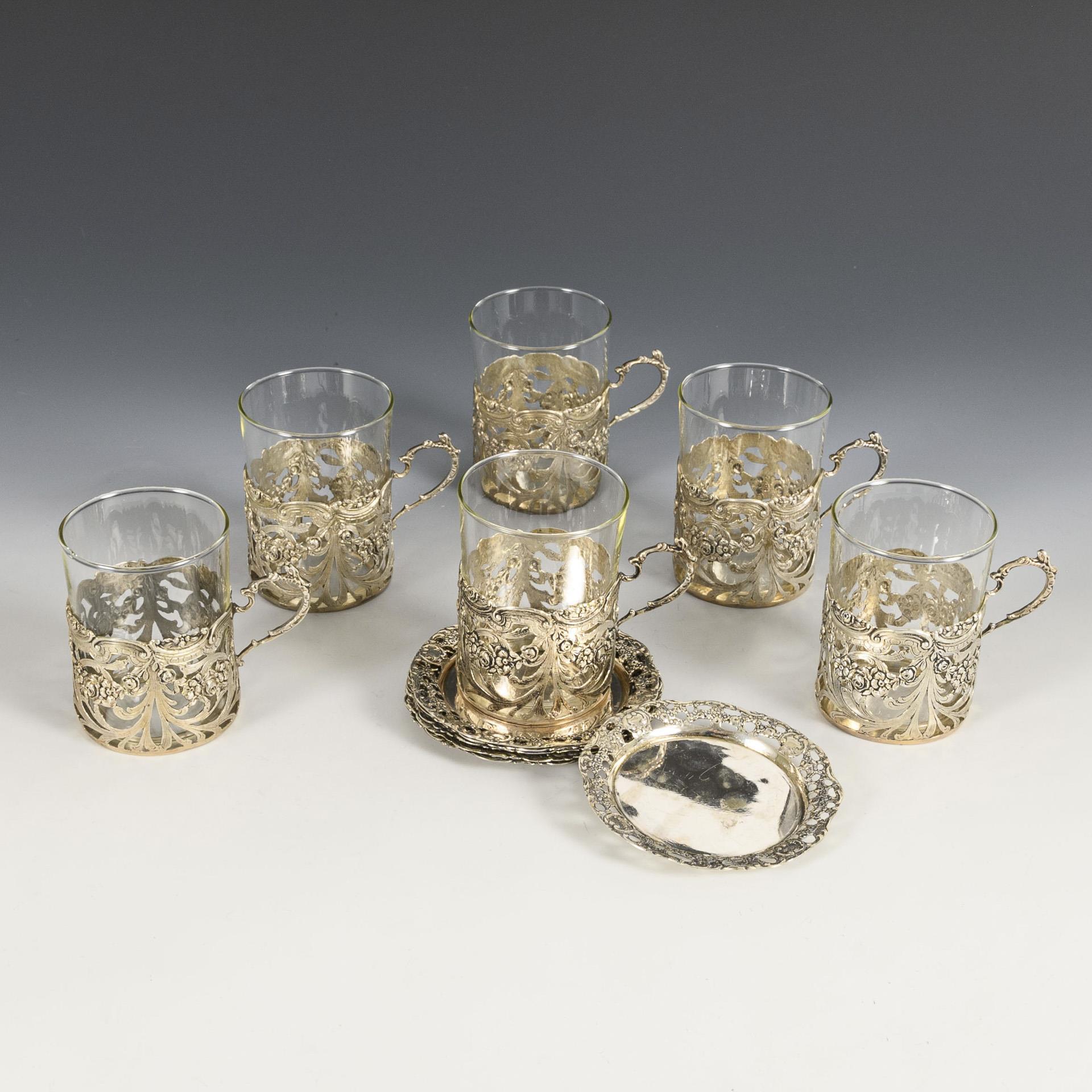 6 Teegläser mit silbernen Haltern und Untersetzern.