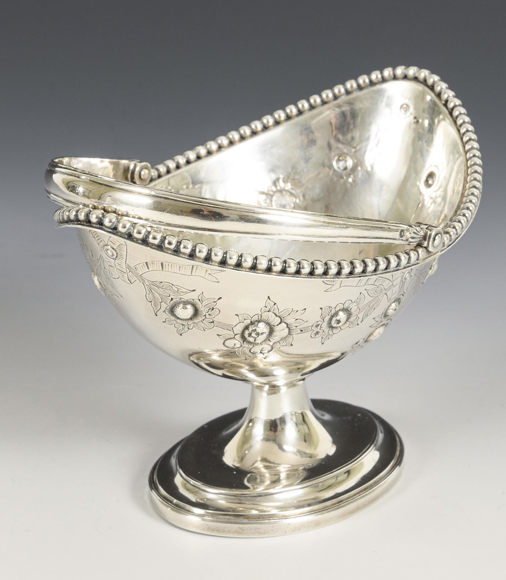 Spitzovale Fußschale mit beweglichem Bügelhenkel. Verziert mit Perlrand und Blütenmotiven. Innen leichte Kratzer, am Stand minimal gedellt.