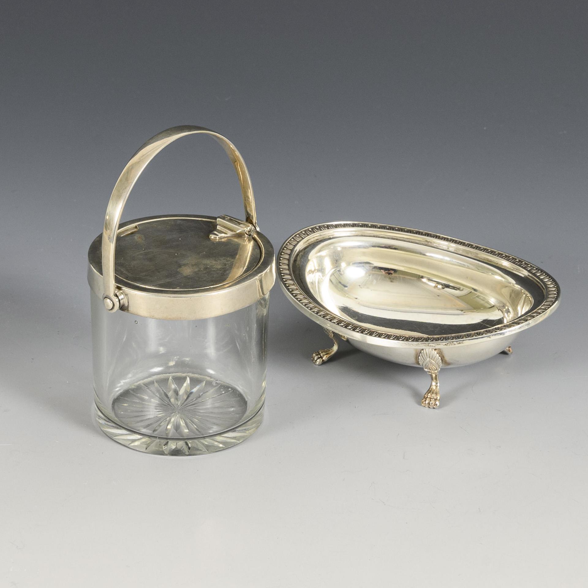 Englisches Marmeladengefäß mit Silbermontierung (durch Bewegen des Henkels öffnet und schließt sich der Deckel, H 12 cm). / Ovale Schale mit Reliefrand, auf 4 Tatzenfüßen (4 x 12 x 9 cm, 77 g). Gebrauchsspuren, Glas mit 1 geplatztem Luftbläschen.