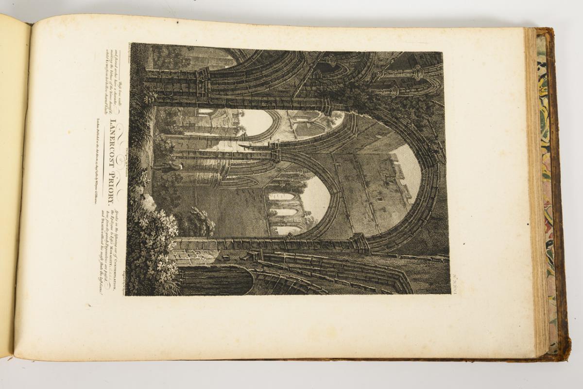 Gestochen von W. Byrne und ungenannt nach Zeichnungen von Thomas Hearne. Zahlreiche Stiche mit ausführlichen Beschreibungen in Englisch und Band zwei auch in Französisch. Beide in unterschiedlichen Ledereinbänden, einer mit Goldschnitt. Vollständig mit 51 und 32 Ansichten. Ein Einbanddeckel lose, schwach stockfleckig, Altersspuren.