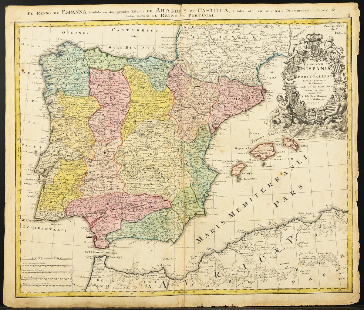 Landkarte des Rheingebietes, Blatt: 61x 52 cm. Detaillierte Rheinlaufkarte vom Bodensee bis zur Nordsee, mit figürlicher Titelkartusche "Theatrum Belli Rhenani [...]" und schemenhafter Gesamtansicht von Landau, großer figürlicher Kartusche unten links "Fluviorium Rheni, Mosae ac Mosella [..]" und mit Nebenkarte des Quellgebietes des Rheins, Legende und Meilenzeigern, ca. 1720. Blatt stockfleckig, hinterklebte Bugfalte, Randbereich gebräunt | Landkarte des Niedersächsischen Reichskreises, Blatt: 52 x 61 cm. Detailreiche Landkarte des nördlichen Teils von Deutschland, mit figürlicher Titelkartusche "Circulus Saxoniae Inferioris [...]", Meilenzeigern, um 1730. Blatt stockfleckig, hinterklebte Bugfalte, unterer Bereich rissig und hinterklebt, Randbereich gebräunt | Landkarte des Fränkischen Reichskreises, Blatt: 61x 52 cm. Detailreiche Karte des Fränkischen Reichskreises mit Rheinlauf, mit figürlicher Titelkartusche "Electoratus Moguntinus ut et palati: infer Hassiae [...]", oberer Rand mit Titel in deutscher Sprache "Anderer und mindere Theil des gantzen hochlöbl. Fränkischen Craisses, mit welchem zugleich das Ertz- Stift- und ChurFürstenthum Mayntz [...]"., Meilenzeiger, ca. 1710. Blatt stockfleckig, hinterklebte Bugfalte, Randbereich gebräunt | Landkarte der Iberischen Halbinsel, Blatt: 52 x 61 cm. Detaillierte Landkarte der Iberischen Halbinsel mit Spanien und Portugal, mit wappenverzierter und allegorischer Titelkartusche "Regnorum Hispaniae et Portugalliae [...]", Meilenzeigern und Titel in spanischer Sprache am oberen Rand, bemerkenswert sind die eingezeichneten alten Straßen, ca. 1728. Blatt stärker griffspurig und stockfleckig, hinterklebte Bugfalte, unterer Rand verstärkt | Landkarte von Venetien, Blatt: 52 x 61 cm. Detaillierte Landkarte der nördlichen Teils von Italien, mit Venetien, Mantua, Emilia-Romagna und dem Golf von von Venedig, figürliche Titelkartusche "Dominii Veneti cum Vicinis Parmae Mutinae Mantuae et Mirandoli [...]", Legende und Meilenzeigern, ca. 1725. Blatt stärker griffspurig und stockfleckig, hinterklebte Bugfalte.