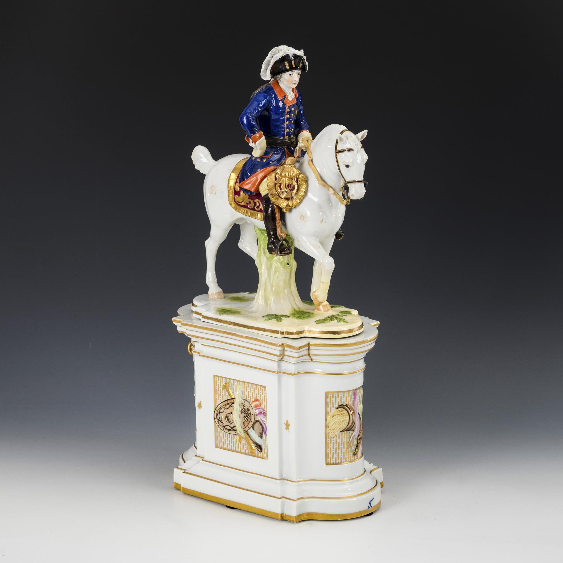 Plastik des Preußenkönigs Friedrich II. zu Pferd (H 29,5 cm). / Architektonischer Sockel mit Trophäenreliefs und dem Monogramm "FR" (= Fridericus Rex). Plinthe der Reiterfigur, Zügel und Degen restauriert, kleiner Haarriss im Sockel.