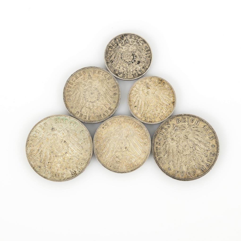 2x 5 Mark 1913, Wilhelm II. in Uniform, "Wilhelm II. Deutscher Kaiser König von Preussen". / 2x 3 Mark 1914, wie vorher. / 2x 2 Mark 1907 und 1911, "Wilhelm II. Deutscher Kaiser König v. Preussen". Zustand: sehr schön.
