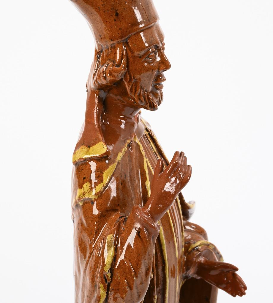 Roter Ton, braun und gelb staffiert, farblos bleiglasiert. H 49 cm.