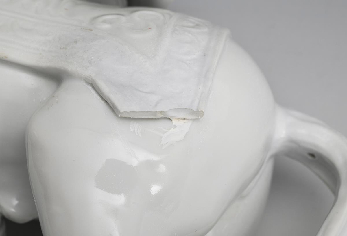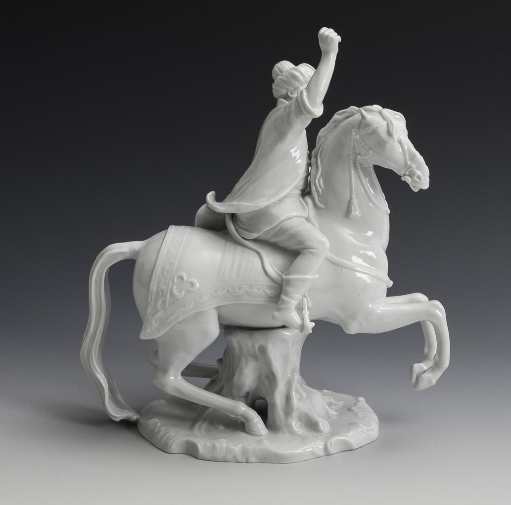 Auf einem Pferd galoppierender, den Säbel schwingender Reiter. Säbel fehlt, 1 Zipfel der Schabracke bestoßen, 1 Zipfel der Schabracke restauriert, linker Fuß mit Steigbügel, Säbel am Gürtel, Schweifansatz und -spitze sowie rechtes Pferdeohr restauriert.