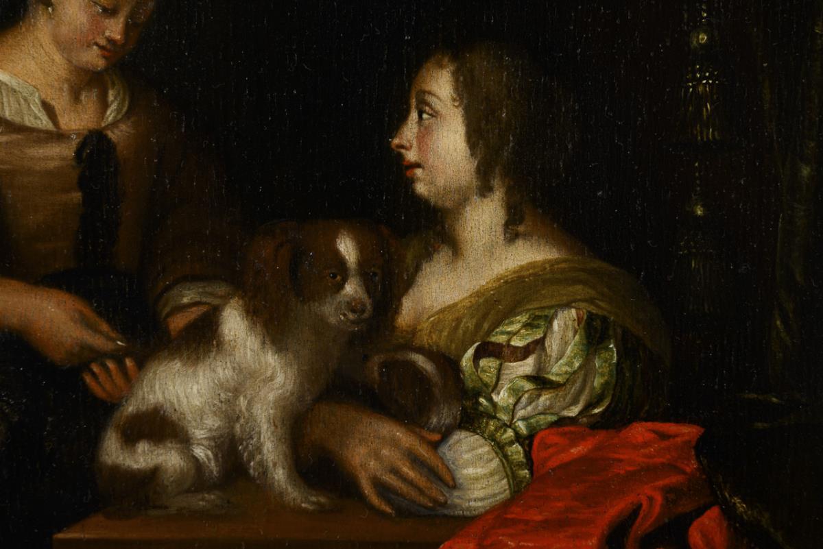 Qualitätvolle Darstellung einer jungen Frau im seidenen Kleid mit einer Magd und einem Hund an einem Tisch. Leichte Altersspuren.