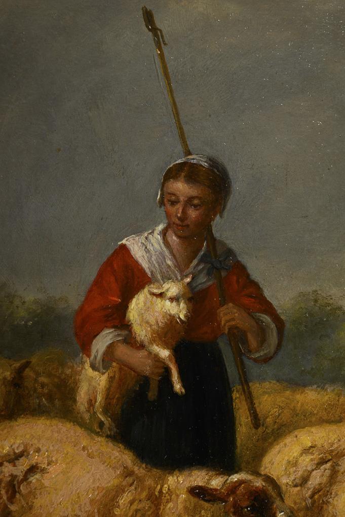 Die Frau mit den Tieren auf einem Weg im Sonnenschein unter wolkigem Himmel. Minimale Altersspuren.