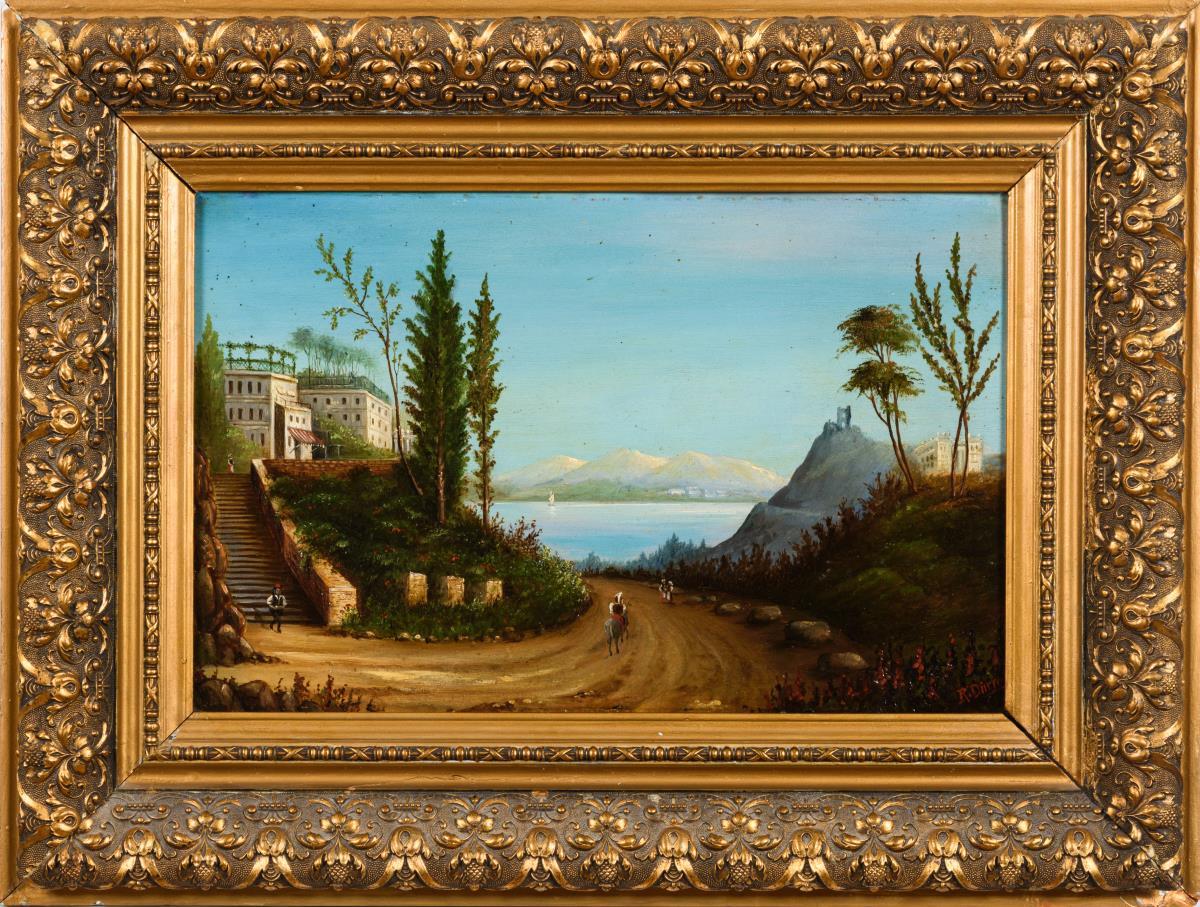 Staffagefiguren bei einem herrschaftlichen Anwesen mit Blick über den See zum Segler und den Bergen am anderen Ufer. Altersspuren.