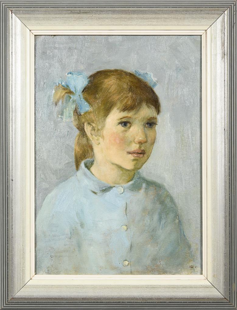 Bildnis eines Mädchens mit blauen Schleifen im Haar vor neutralem Hintergrund.