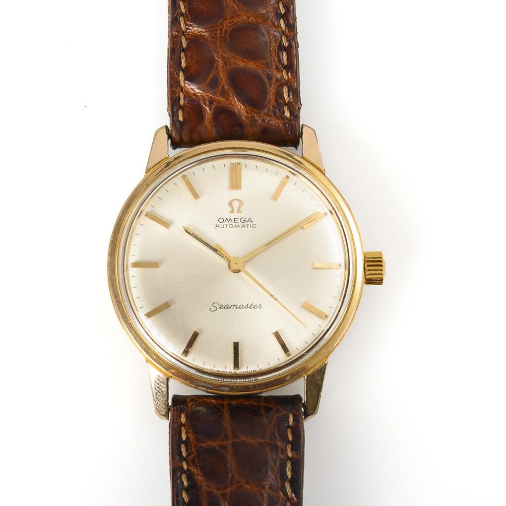 Rundes, vergoldetes Gehäuse mit Plexiglas und geschraubtem Edelstahlboden, an braunem Krokodillederband mit vergoldeter Dornschließe. Minimale Gebrauchs- und leichte Tragespuren.