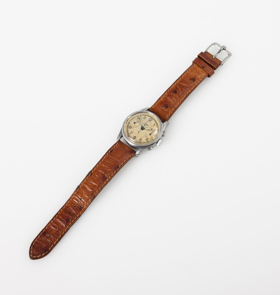 Mechanisches Werk mit Kronenaufzug. Im Kurzzeittest funktionstüchtig. Chamapagnerfarbenes Ziffernblatt mit arabischen Zahlen, Minutenkranz mit 5-Sekunden-Einteilung, Telemeterskala in Rot, Hilfszifferblättern für kleine Sekunde und 30-Minutenanzeige, Leuchtzeigern, Stoppfunktion mit 2 Stellknöpfen.