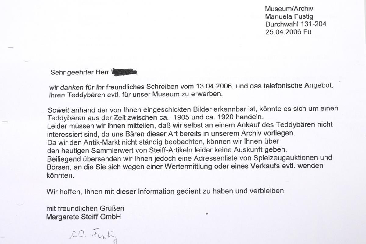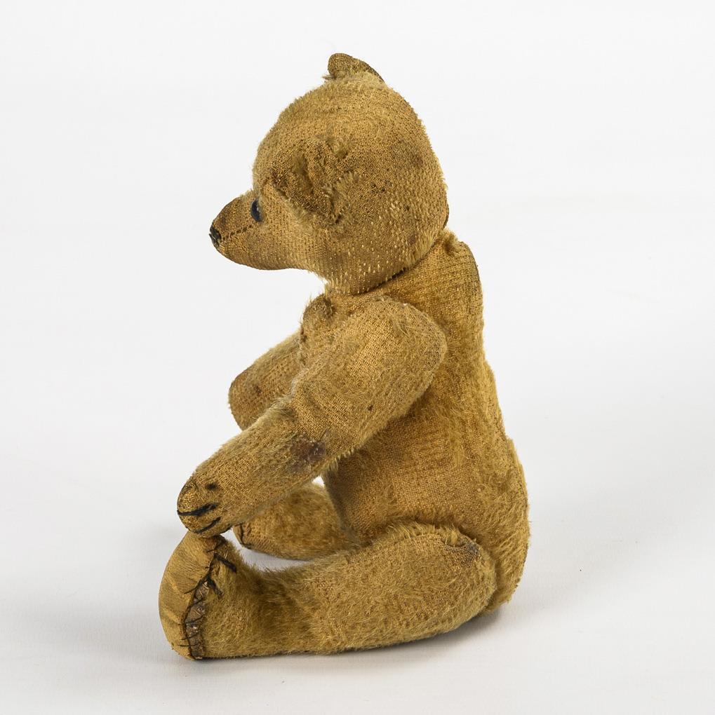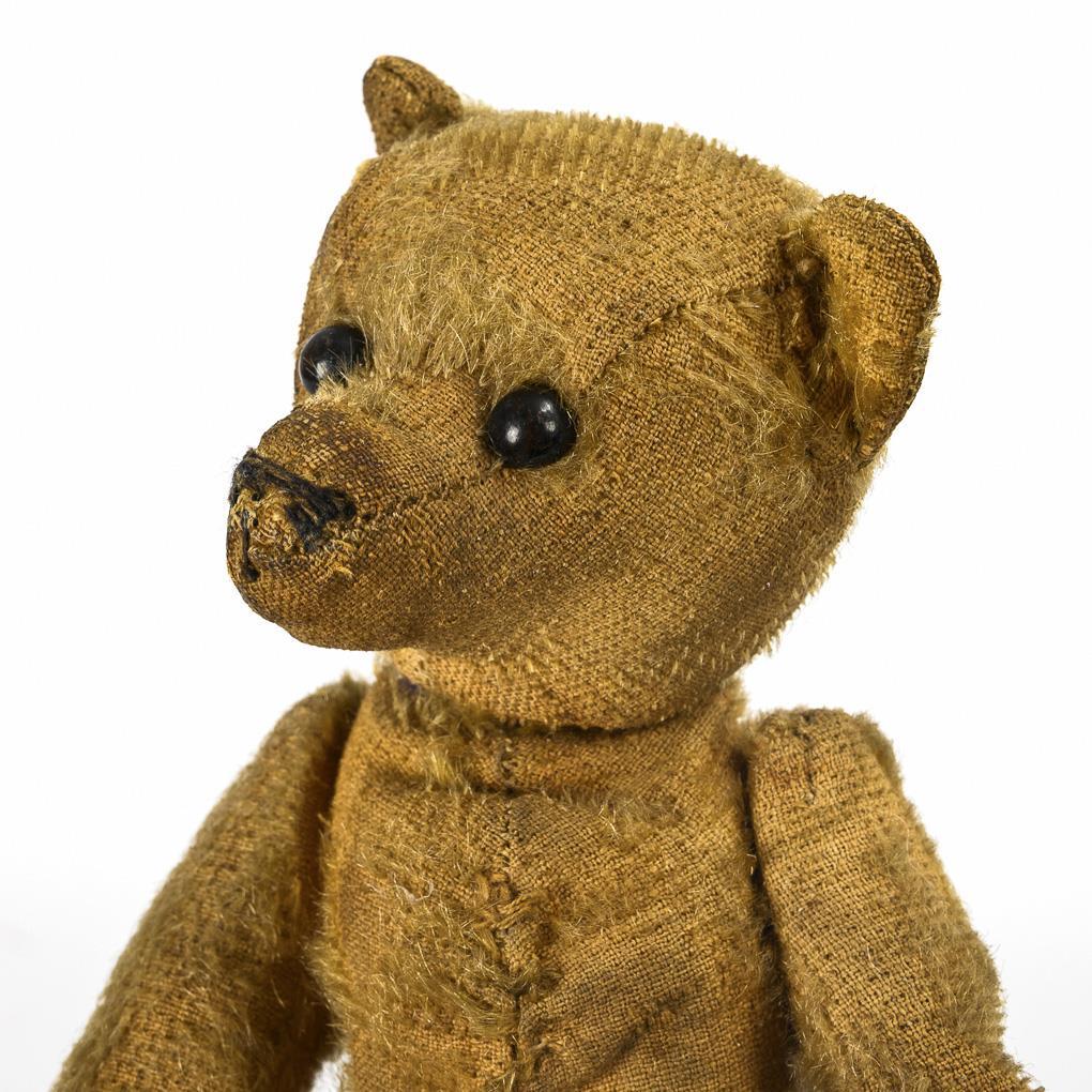 Kleiner, verkahlter Teddybär mit schwarzen Schuhknopf-Augen. Dazu Korrespondenz des Einlieferers mit dem Steiff-Museum in Giengen über den Teddy. Stark abgeliebt, Augen wohl ergänzt, mehrere Reparaturstellen.