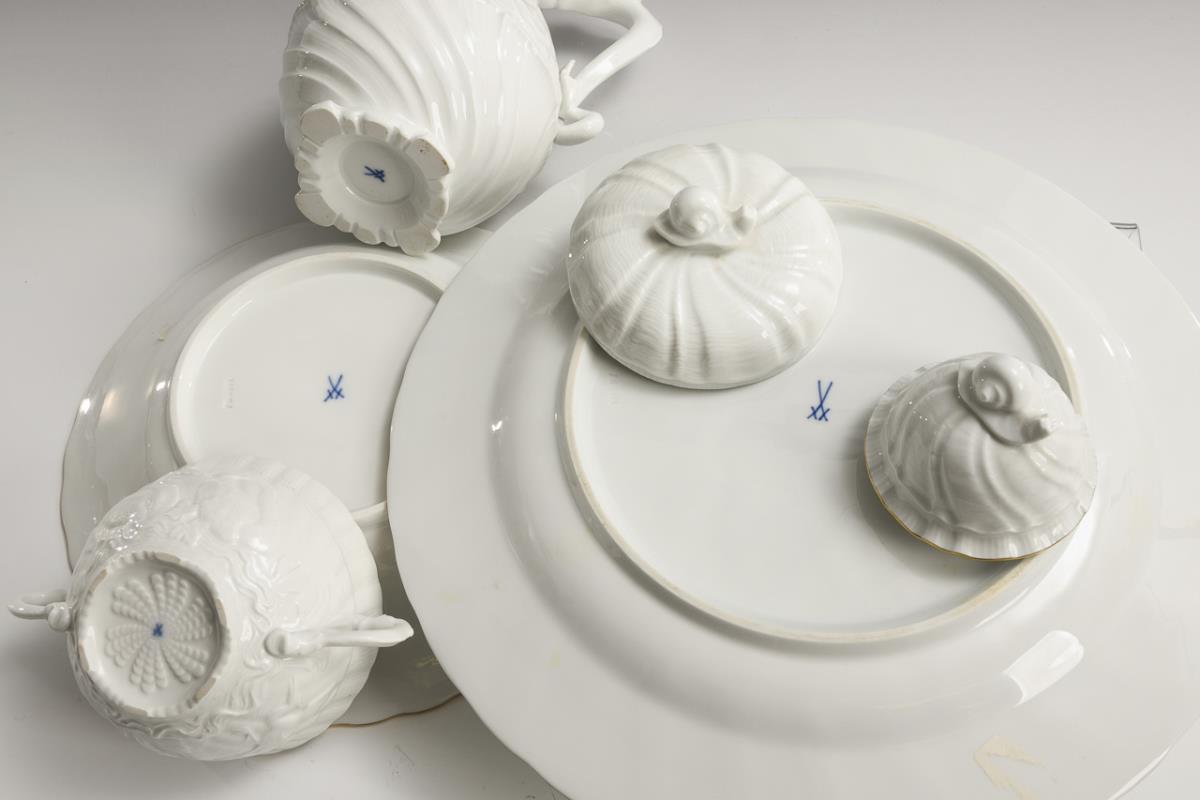 Kanne, Zuckerdose, Teller und Platte mit Schwanenservice-Dekor. Meissen.