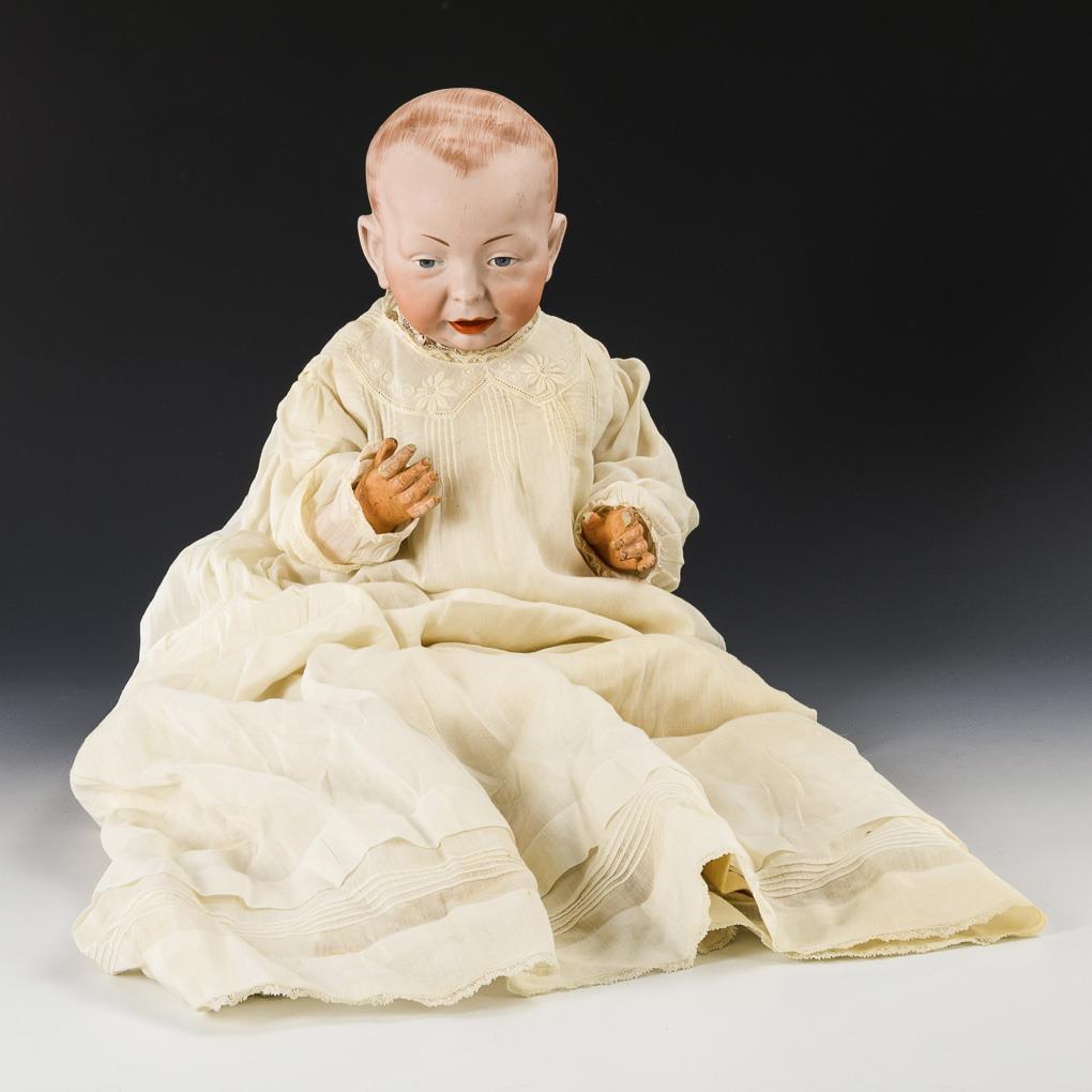 Sogenanntes "Kaiserbaby" mit Vollkopf, gemalten blauen Augen, offen-/geschlossenem Mund, gemalten Haaren. 5-teiliger Sitzbabykörper und mehrere weiße Kleider. Hände berieben, 2 Finger bestoßen.
