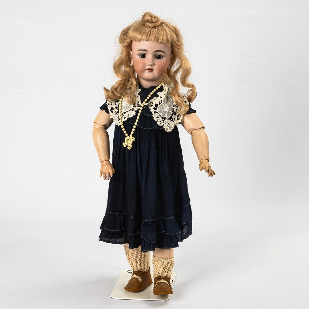 Kurbelkopf, braune Schlafaugen, Ohrringe, lange Echthaarperücke. 15-teiliger Gliederkörper. Dunkelblaues Kleid mit weißem Spitzenkragen, braune Lederschuhe. Kopf durchleuchtet: ohne Defekte. Hände leicht verschieden.